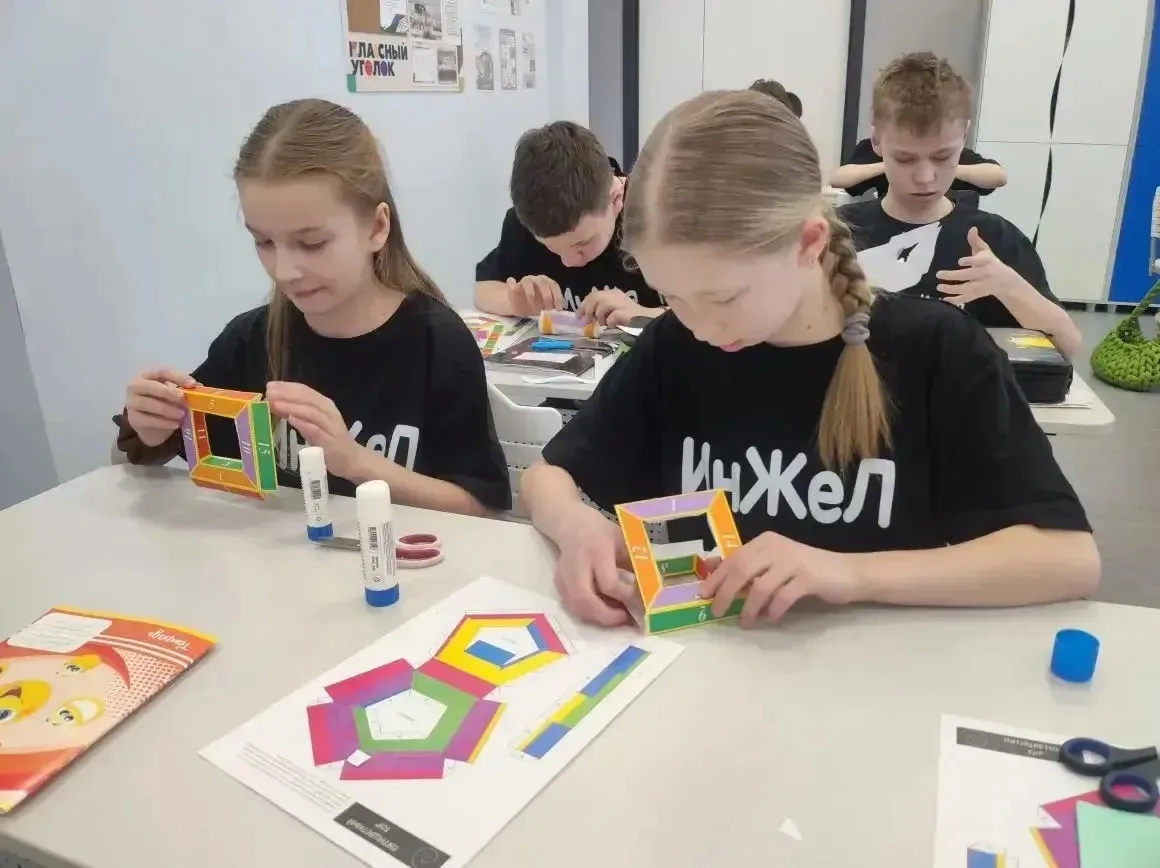 2️⃣погружение в мир объёмных фигур: исследовали загадочную «Чёртову рамку», а после перешли к практике — складывали из бумаги многогранники.