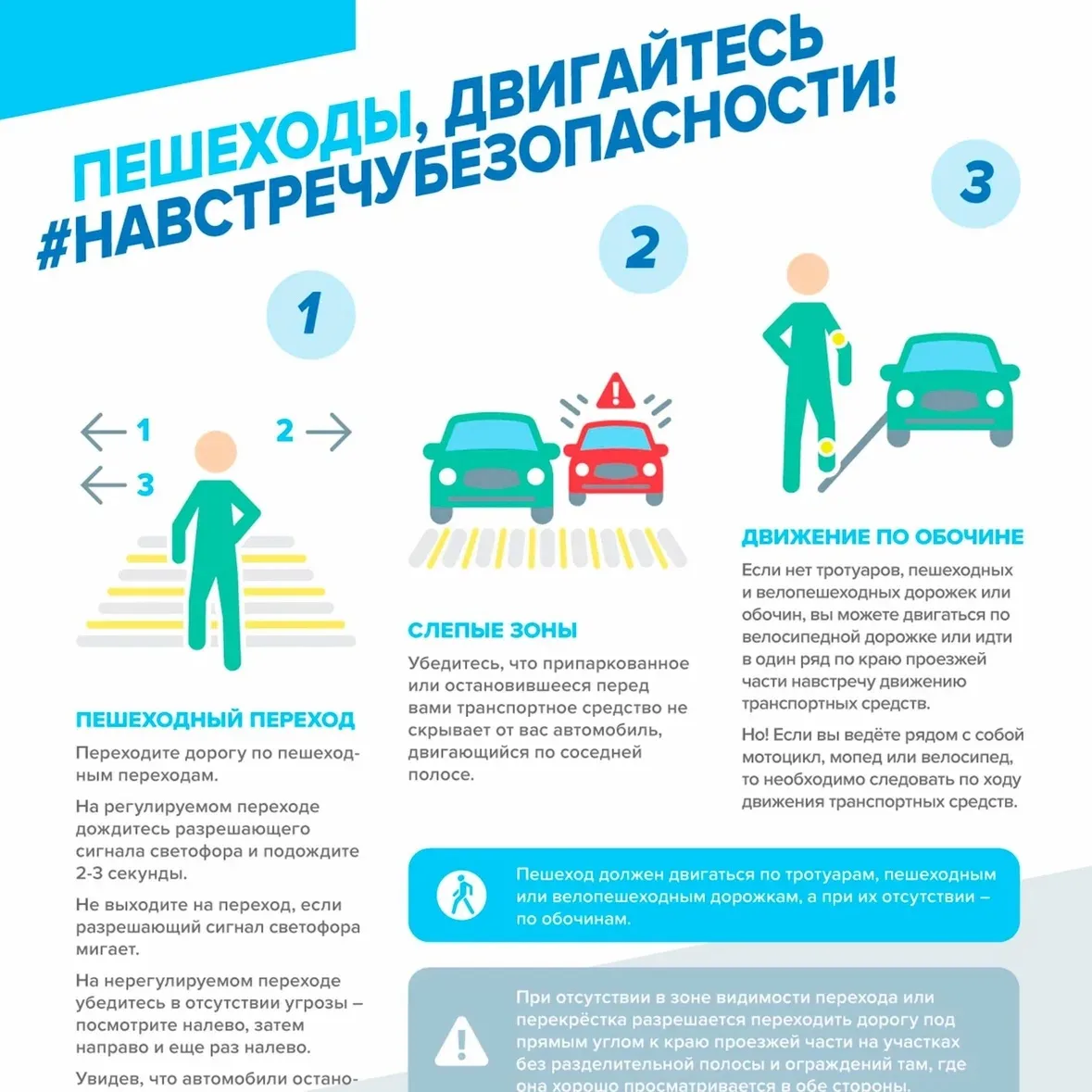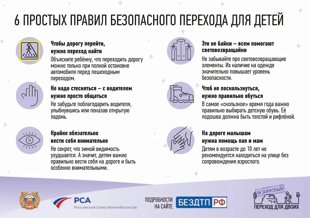 📌 Повторите основные ПДД для пешеходов: переход дороги только по «зебре» и на зелёный сигнал светофора, запрет игр у проезжей части.
