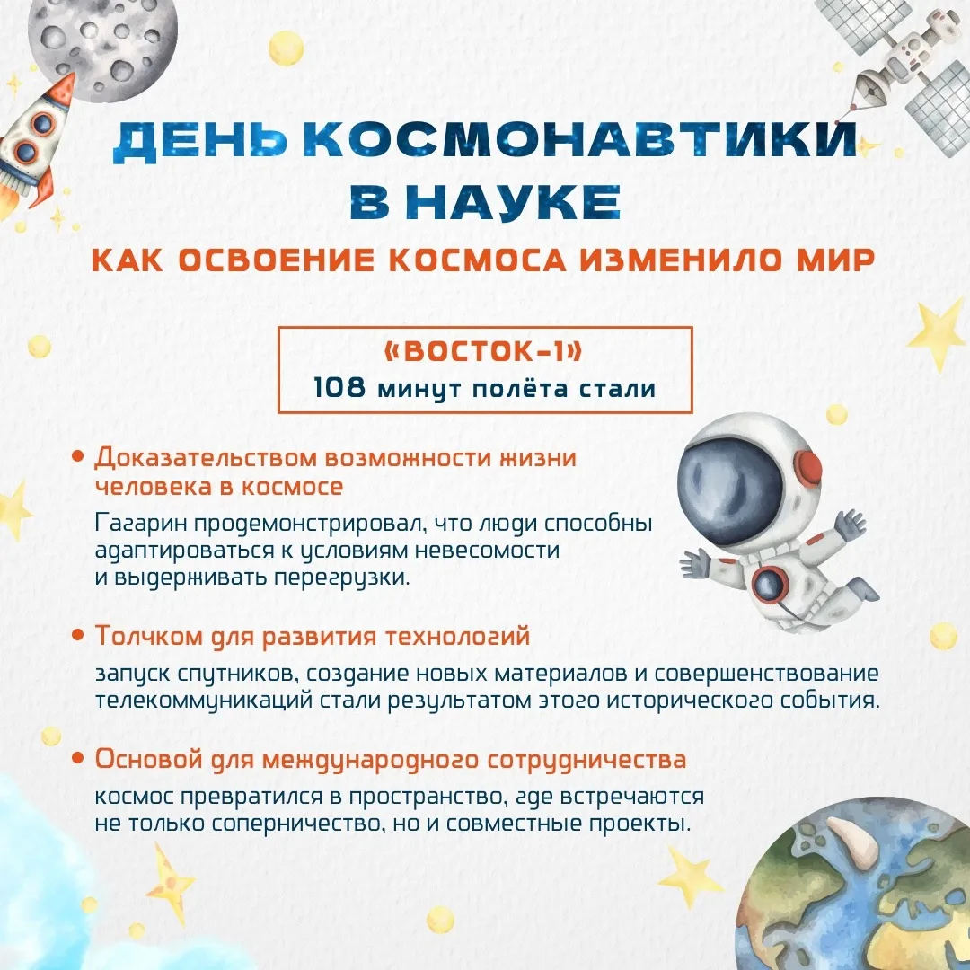 Подвиг Юрия Гагарина не просто изменил мир. Он раздвинул границы возможного, став вдохновляющим примером для будущих поколений, пробудил интерес многих ребят к науке, дал мощный импульс развитию образования.