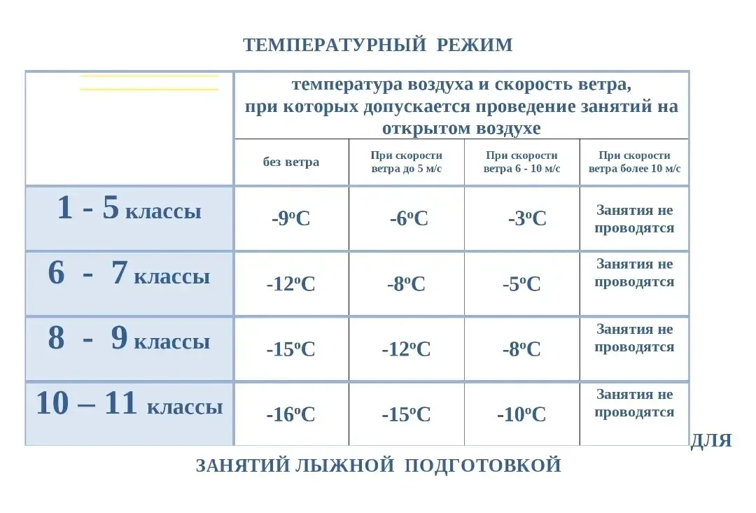 Уважаемые папы и мамы. Информация о температурном режиме для занятий лыжной подготовкой. Температуру смотрим на Гисметео.