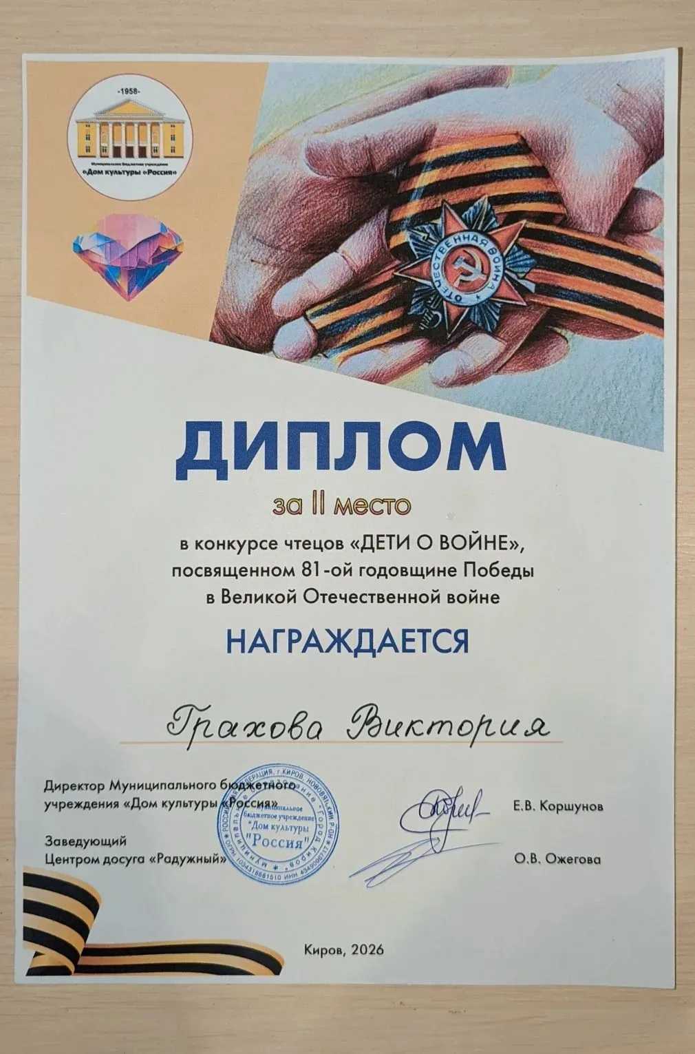 30 марта ученица 2а класса МБОУ СОШ 34 города Кирова Грахова Виктория (театральная студия "Мандаринка"руководительЕ.С.Кошурникова)заняла 2 место в городском конкурсе чтецов "Дети о войне".Поздравляем с победой!