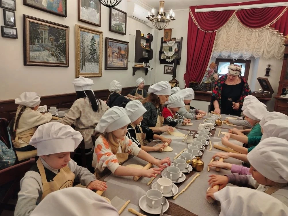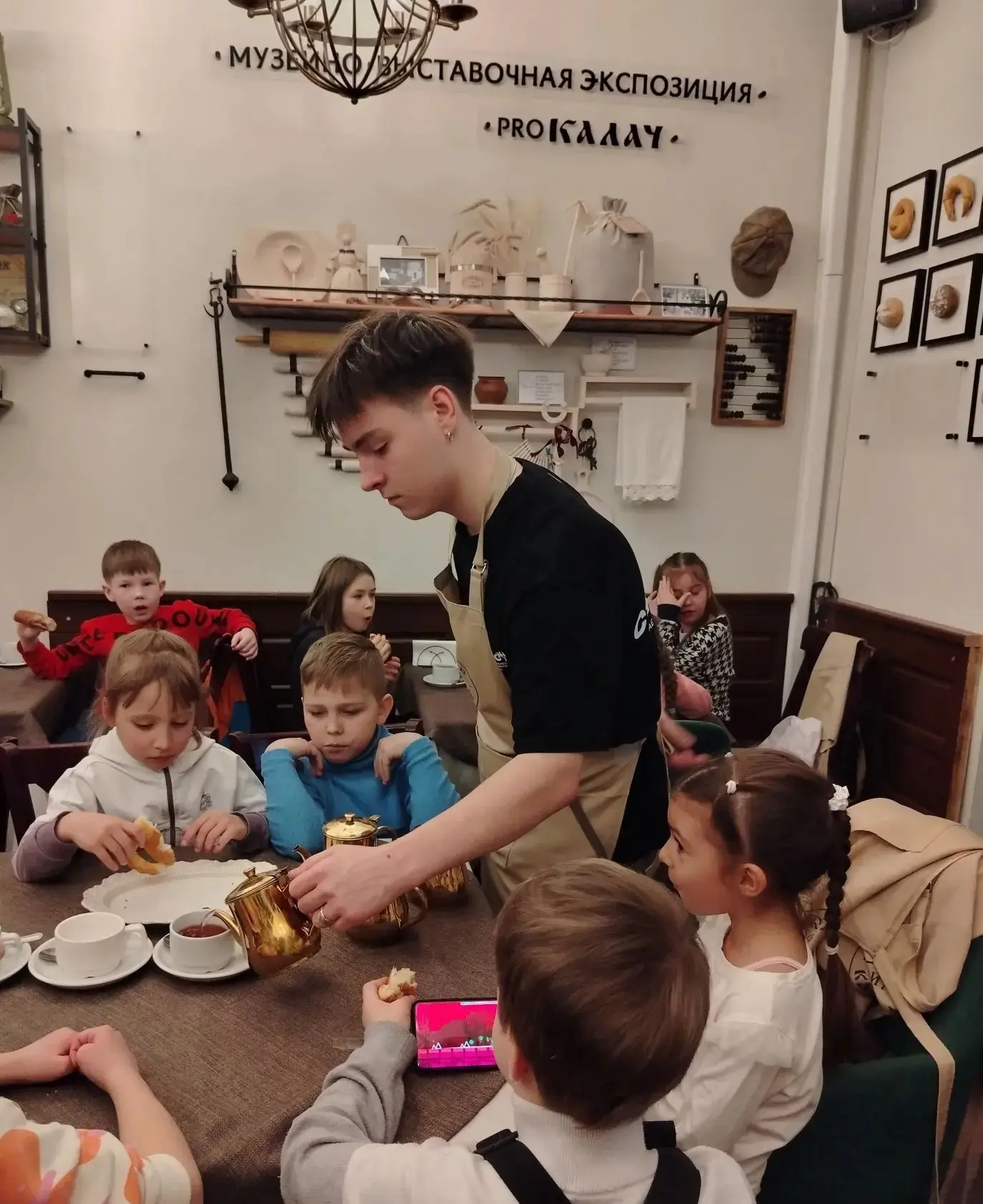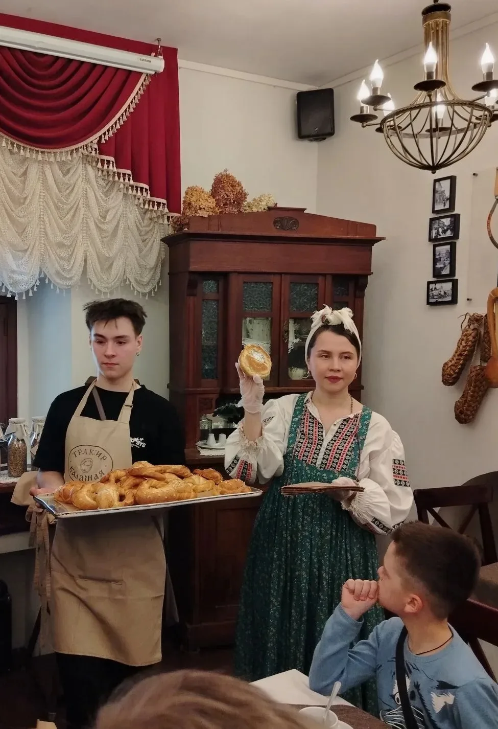 🥨Свежеслепленные калачи отправились в печь, а пока они румянились, гостей ждал сюрприз - ароматное чаепитие с калачами, испечёнными специально к их приезду самой хозяйкой. За столом ребята вместе с купчихами читали старинные присказки и поговорки, узнавая, как калач воспевали в народе.