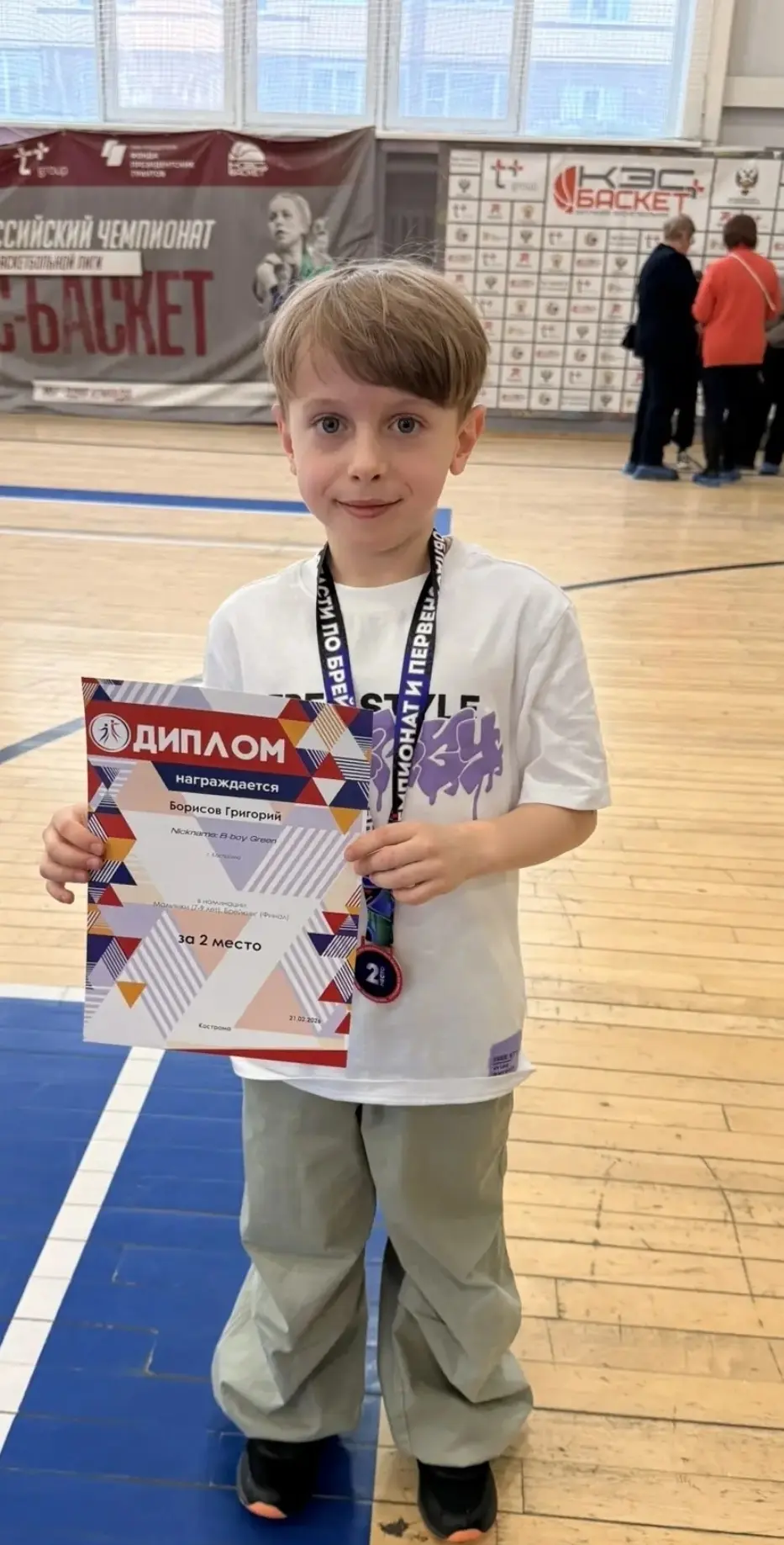 🥈21 февраля 2026 года ученик 1 "В" класса Григорий Борисов занял 2 место в Чемпионате Костромской области по брейк-дансу в категории мальчиков 7-9 лет.