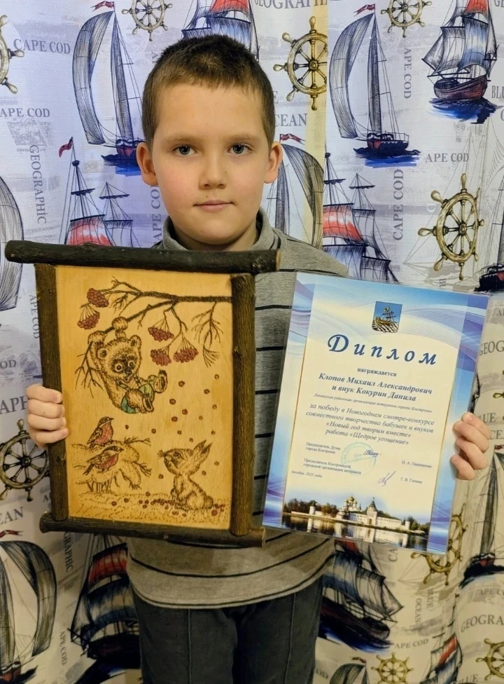 🏆Данила самостоятельно переводил, выжигал и раскрашивал рисунок под руководством дедушки Михаила Александровича Клопова и одержал победу!