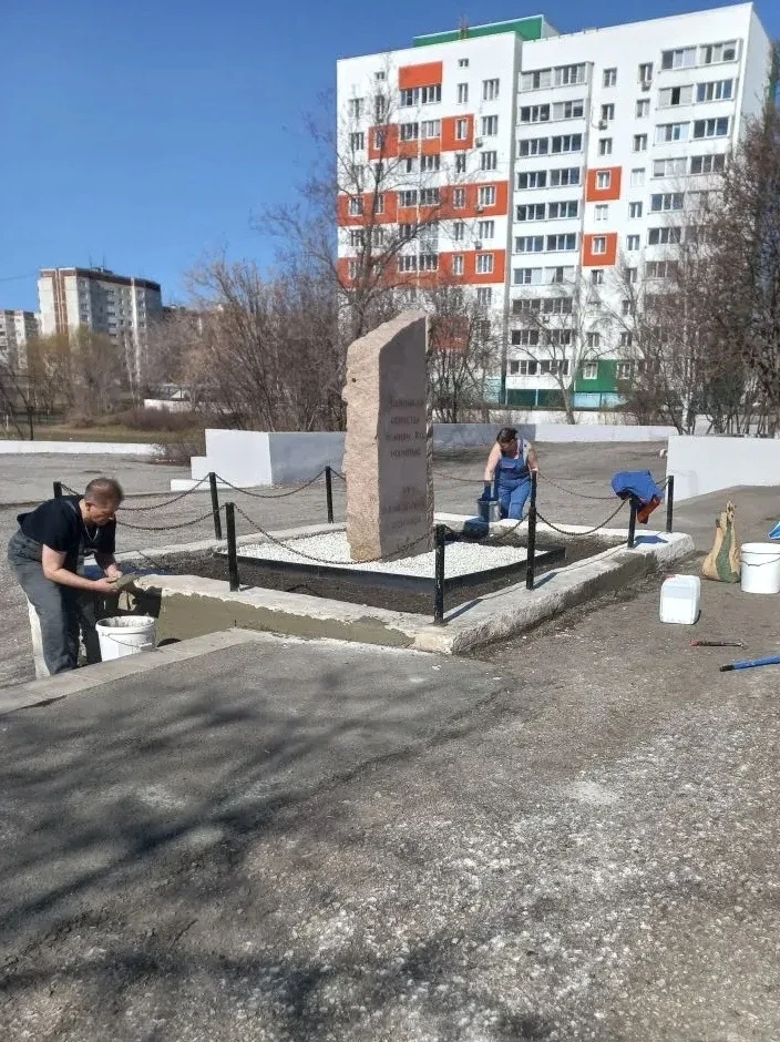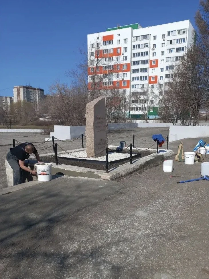 Работниками школы был проведен косметический ремонт Камня памяти, расположенного на территории нашей школы.