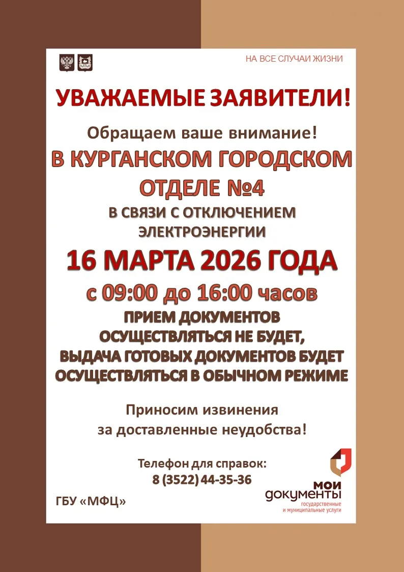 ☝️ПРЕДЛАГАЕМ ОЗНАКОМИТЬСЯ С ИЗМЕНЕНИЕМ РЕЖИМА РАБОТЫ КУРГАНСКОГО ГОРОДСКОГО ОТДЕЛА № 4 В СВЯЗИ С ОТКЛЮЧЕНИЕМ ЭЛЕКТРИЧЕСТВА 16 МАРТА 2026 ГОДА