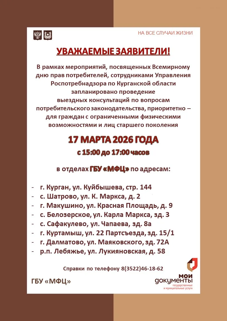⚡17 МАРТА СОТРУДНИКИ УПРАВЛЕНИЯ РОСПОТРЕБНАДЗОРА ПО КУРГАНСКОЙ ОБЛАСТИ ПРОВЕДУТ БЕСПЛАТНЫЕ ВЫЕЗДНЫЕ КОНСУЛЬТАЦИИ НА БАЗЕ НЕСКОЛЬКИХ ОТДЕЛОВ ГБУ "МФЦ"👆