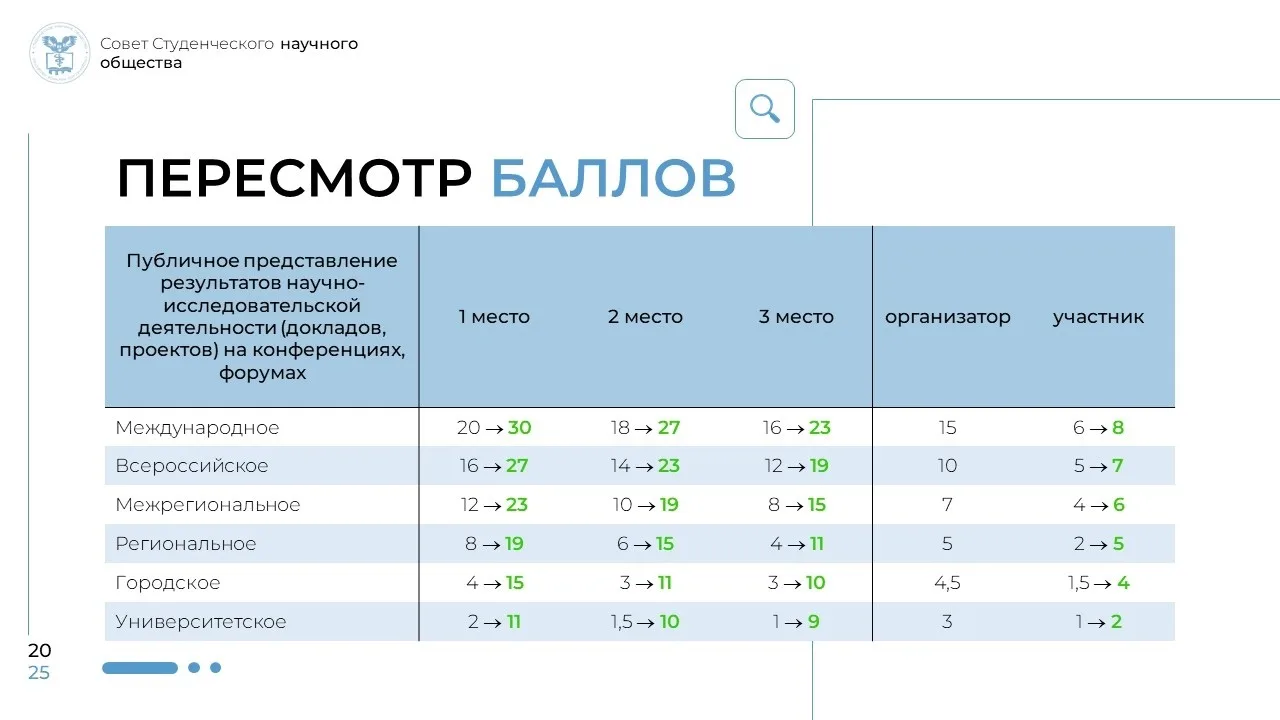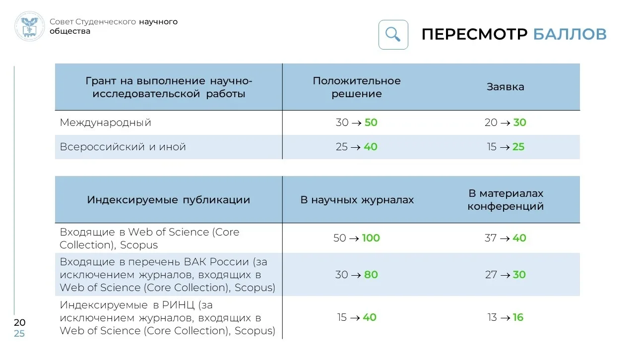 📈Ключевые виды научной деятельности теперь оцениваются выше. Ваши публикации, выступления и гранты принесут больше баллов в научном рейтинге: