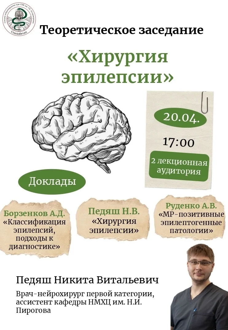 🧠 Секция нейрохирургии «Cranioforum» приглашает вас на теоретическое заседание по теме «Хирургия эпилепсии: от диагностики к оперативному лечению»