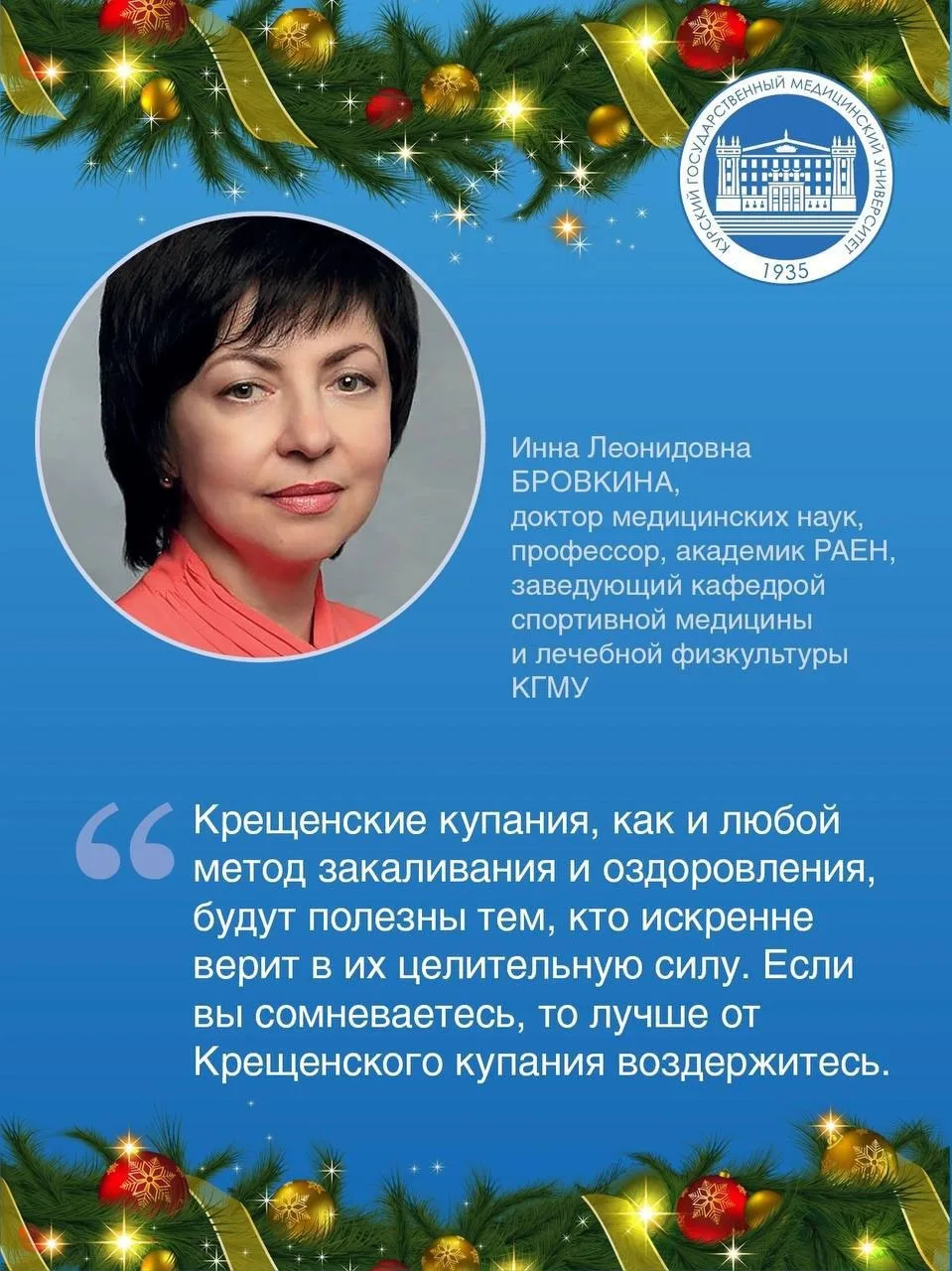 📅19 января православные христиане будут отмечать большой праздник - Крещение Господне. Одно из его традиций - омовение в проруби. Но купание в ледяной воде может таить в себе опасные последствия для здоровья. О том, как не навредить своему организму, соблюдая праздничную традицию, рассказала д.м.н, профессор, академик РАЕН, заведующий кафедрой спортивной медицины и лечебной физкультуры КГМУ ИННА ЛЕОНИДОВНА БРОВКИНА: