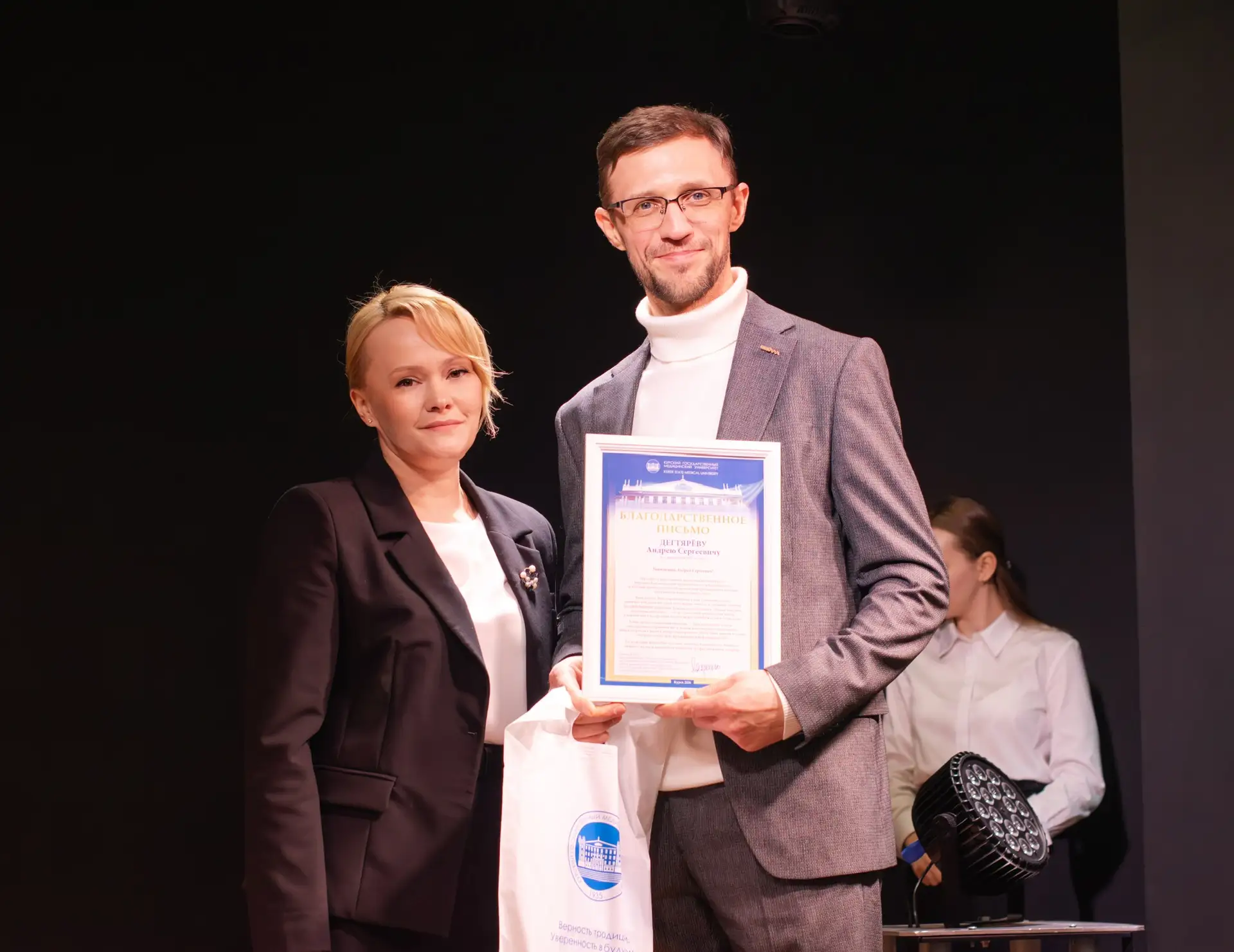 Отдельные слова благодарности мы адресуем проректору по воспитательной работе, социальному развитию и связям с общественностью Алесе Анатольевне Кузнецовой. Вы не только мудрый руководитель, но и автор огромного количества материалов о нашем вузе, которые выходят даже на страницах федеральных изданий, прославляя КГМУ далеко за его пределами.