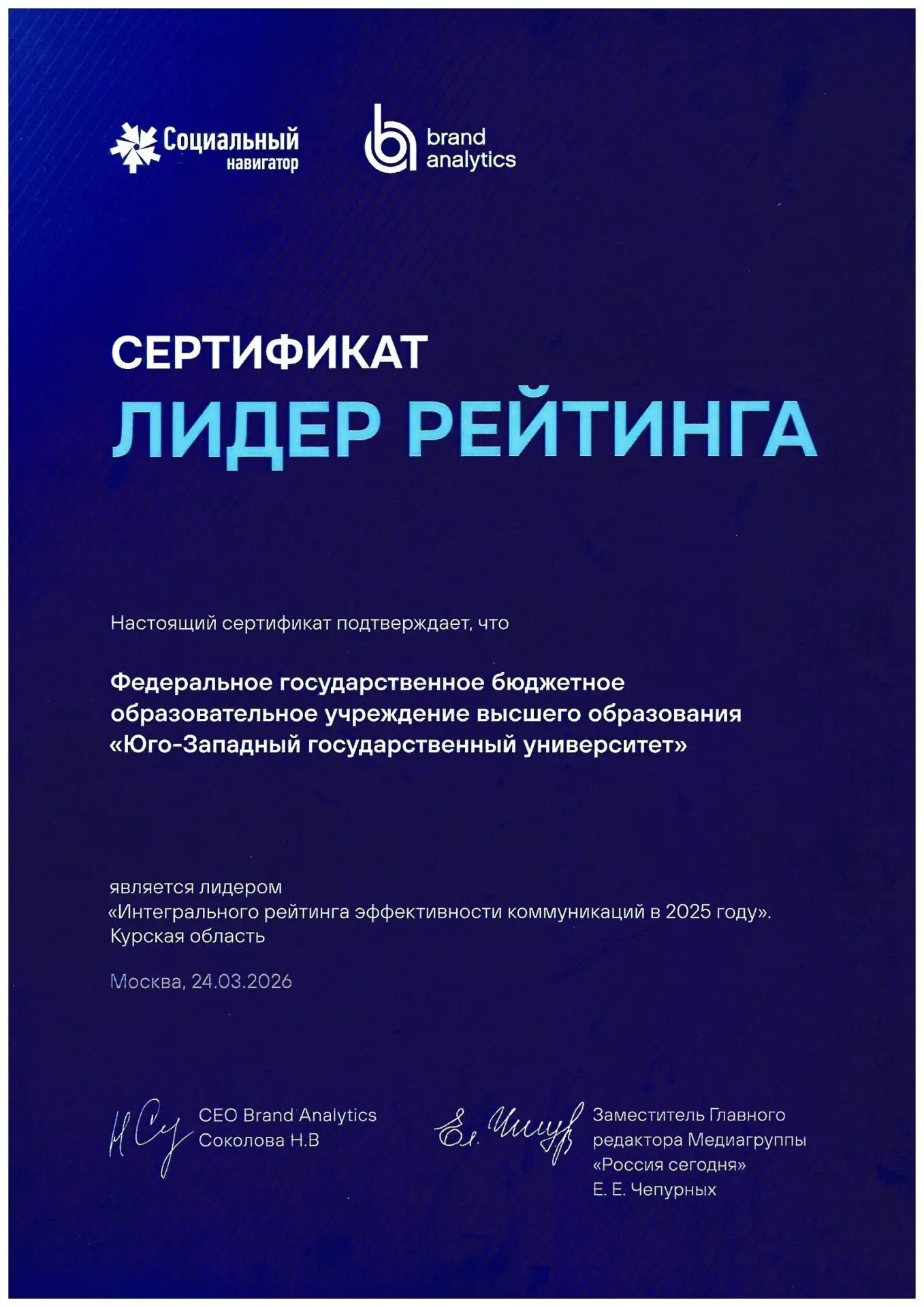 Сертификат подтверждает высочайший уровень взаимодействия ЮЗГУ с абитуриентами, студентами, выпускниками, учеными и бизнесом. Рейтинг подготовлен экспертами «Социального навигатора» медиагруппы «Россия сегодня» и аналитической компании Brand Analytics.