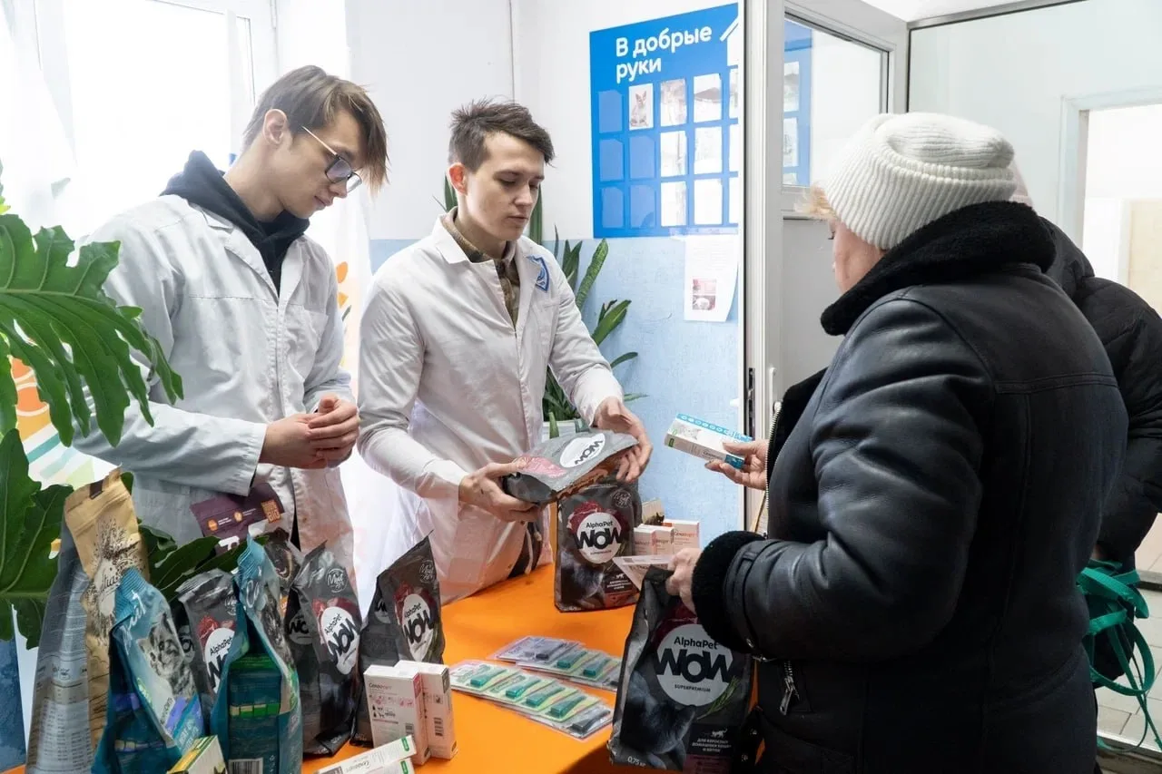 🐶🐱 В рамках акции ветврач Оксана Карпухно вместе со студентами-первокурсниками Алексеем Рыловым и Олегом Белогуровым провели осмотр домашних животных вынужденных переселенцев. Питомцы получили специализированные корма и препараты для профилактики паразитарных заболеваний.