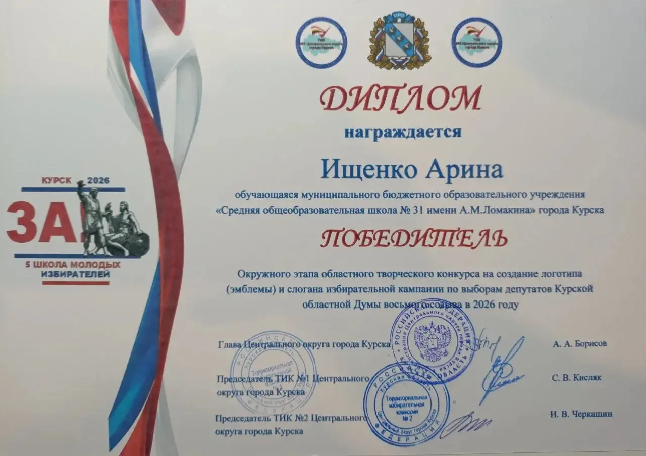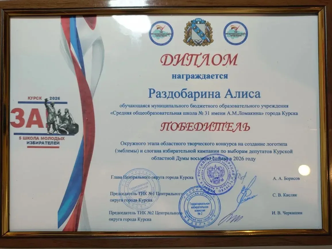 Сегодня в Администрации Центрального округа города Курска состоялось награждение победителей Окружного этапа областного творческого конкурса на создание логотипа (эмблемы) и слогана избирательной кампании по выборам депутатов Курской областной Думы в 2026 году!