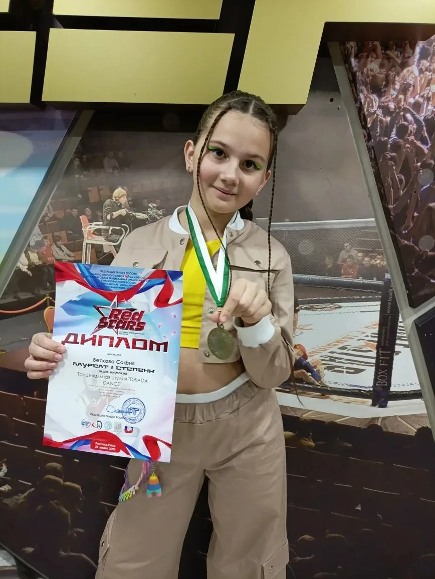 🏆 В Курске прошёл Всероссийский танцевальный фестиваль «RED STARS». Веткова Софья, ученица 3 А класса, в составе танцевальной студии "DRIADA DANCE» стала лауреатом 🥇первой степени. 👍