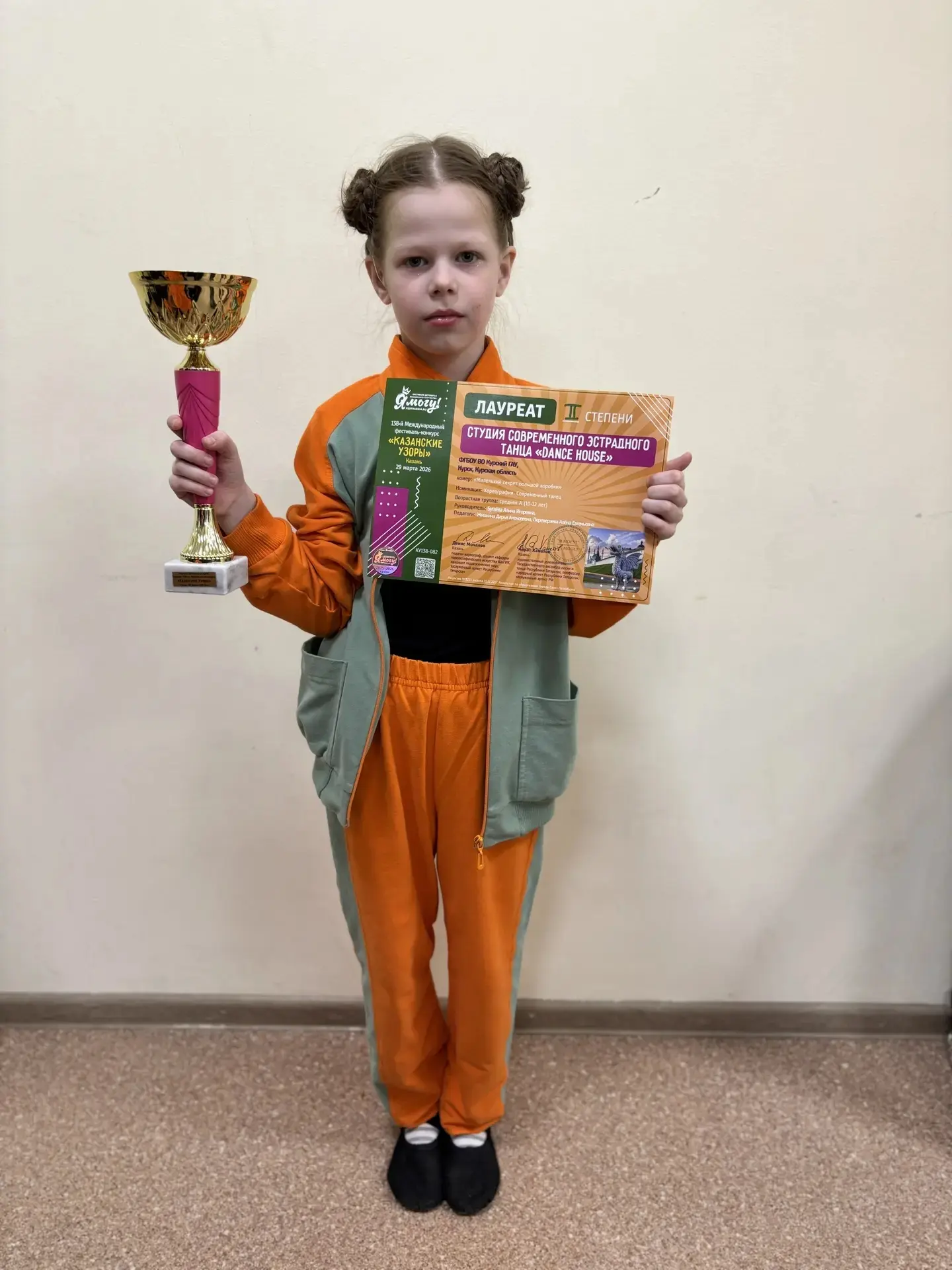 Сегодня обучающаяся 1А класса Калугина Дарья выступала в Казани на 138-м Международном фестивале-конкурсе детского и юношеского творчества «Казанские узоры» с танцевальным коллективом Dance House.