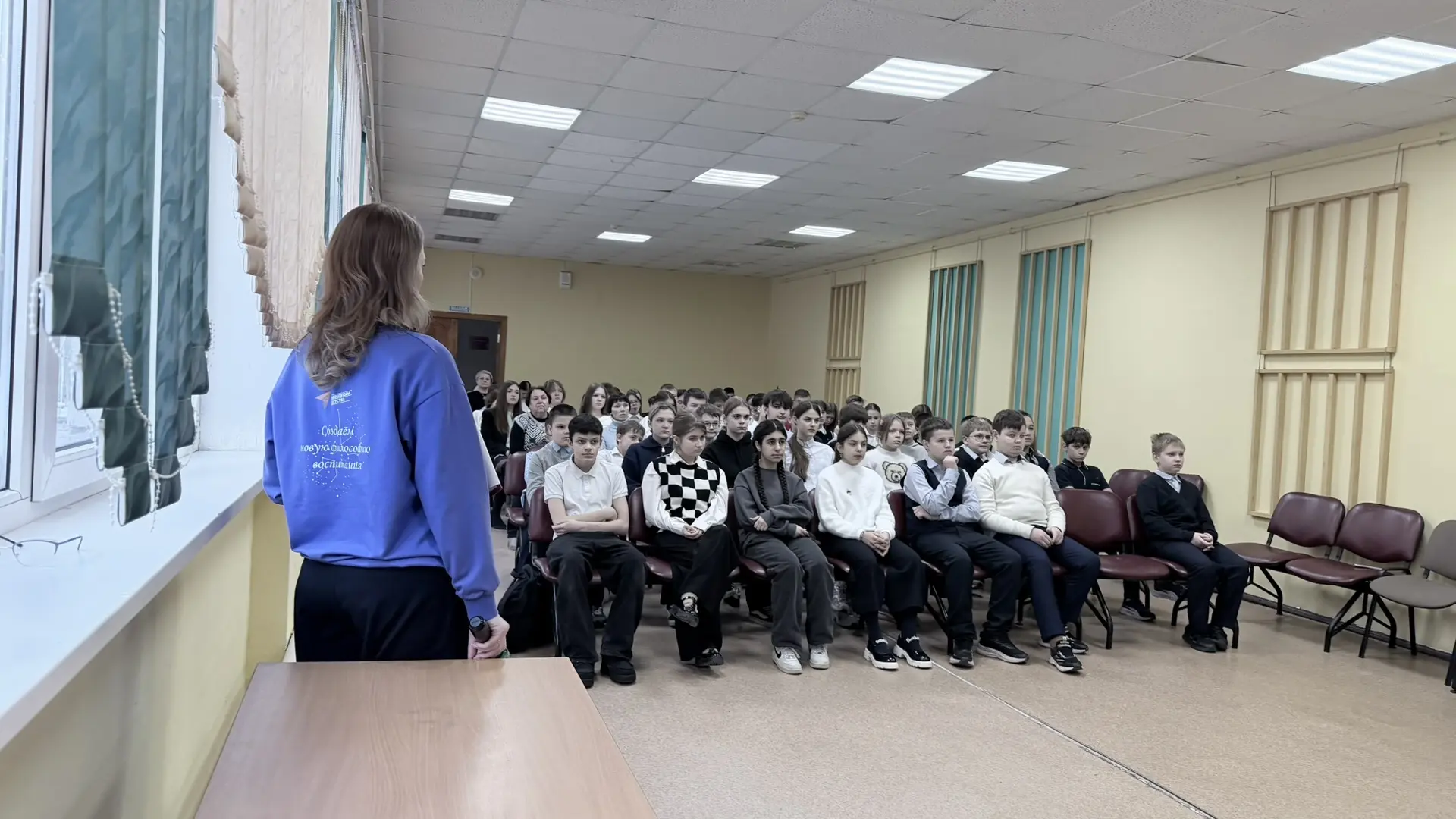 С приветственным словом выступила директор школы № 27 имени А.А. Дейнеки г. Курска Кристина Анатольевна Согачева, которая объявила о старте большого общешкольного проекта «Страна дружбы»!