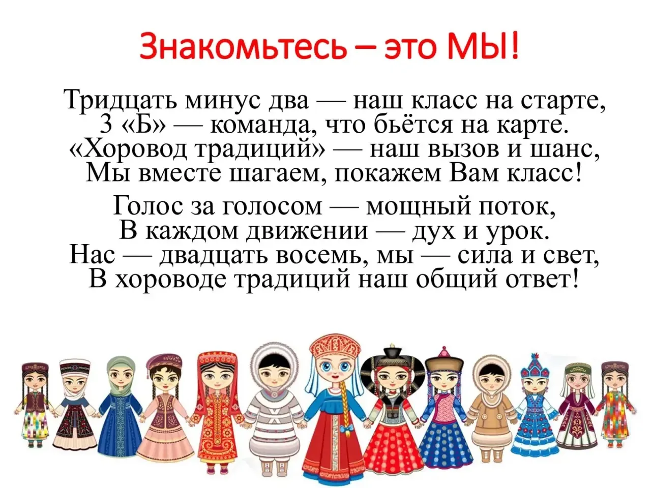 💫Наши ученики подготовили второе конкурсное испытание под названием «Дружба народов». Его цель — в творческом формате показать национальный состав своего класса, продемонстрировать уважение и любовь к многообразию культур, которые объединяют ребят в единую дружную команду.