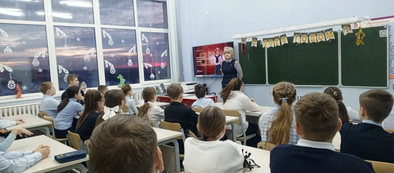 В МБОУ СОШ № 62 имени В.С. Барышева советник директора по воспитанию Мезенцева Кристина Владимировна провела увлекательное внеурочное занятие — «Мозаика зимних чудес: новогодние традиции народов России» для учеников 5 классов.