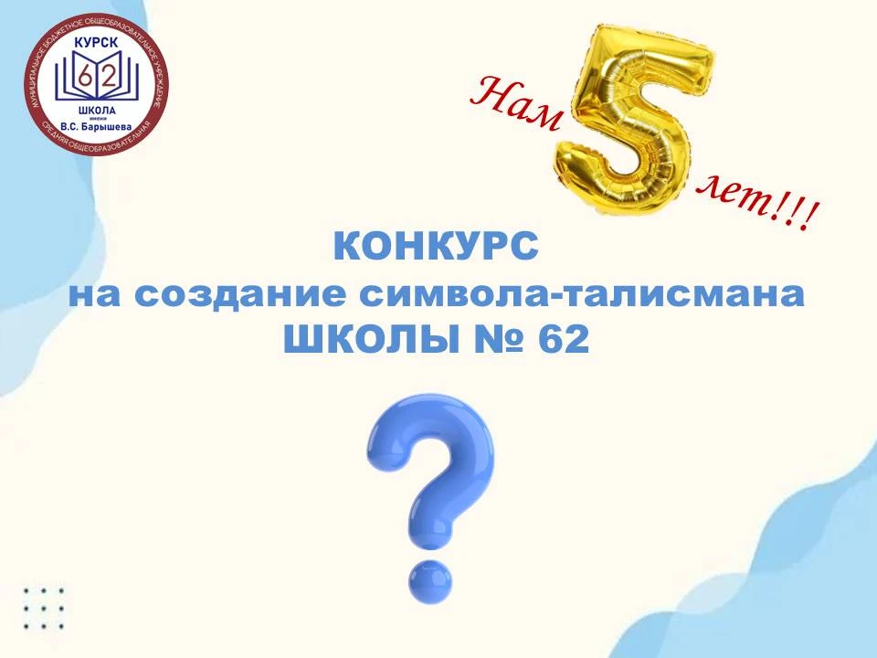 В рамках празднования 5-летия нашей школы мы запускаем масштабный и очень творческий конкурс — на создание официального символа-талисмана МБОУ СОШ № 62 имени В.С. Барышева! ✨