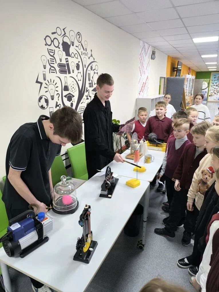 А ученики 9 "В" класса, под чутким руководством учителя физики, Чаблина Андрея Анатольевича, организовали активные перемены для учеников начальной школы, продемонстрировав зрелищные физические опыты и эксперименты! ✨ Маленькие зрители были в восторге!