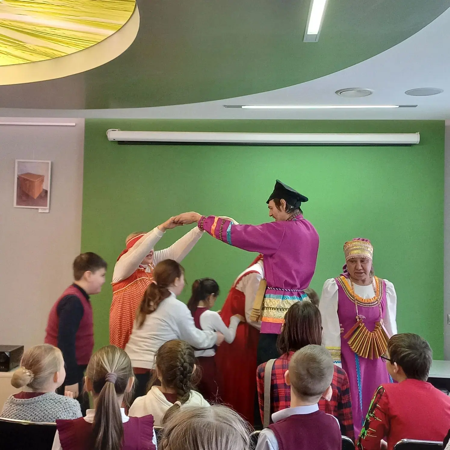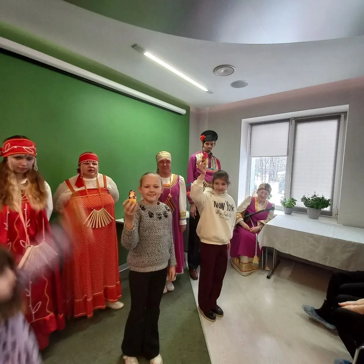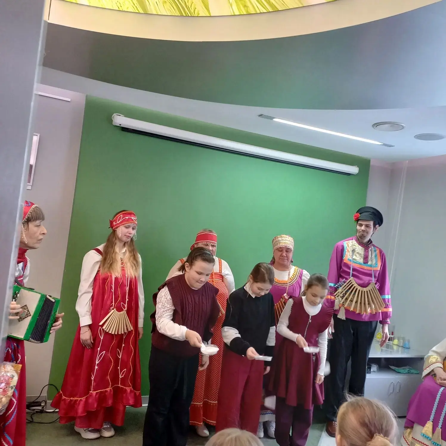 В зале нас ждали участники ансамбля "Веснянка". Под их Масленичные заигрыши дети вспомнили названия праздничных дней, поиграли в русские народные игры, пели песни, танцевали, участвовали в конкурсах. Все окунулись в весёлую праздничную атмосферу. Конечно, были и блины - угощение от работников ФОСАГРО.