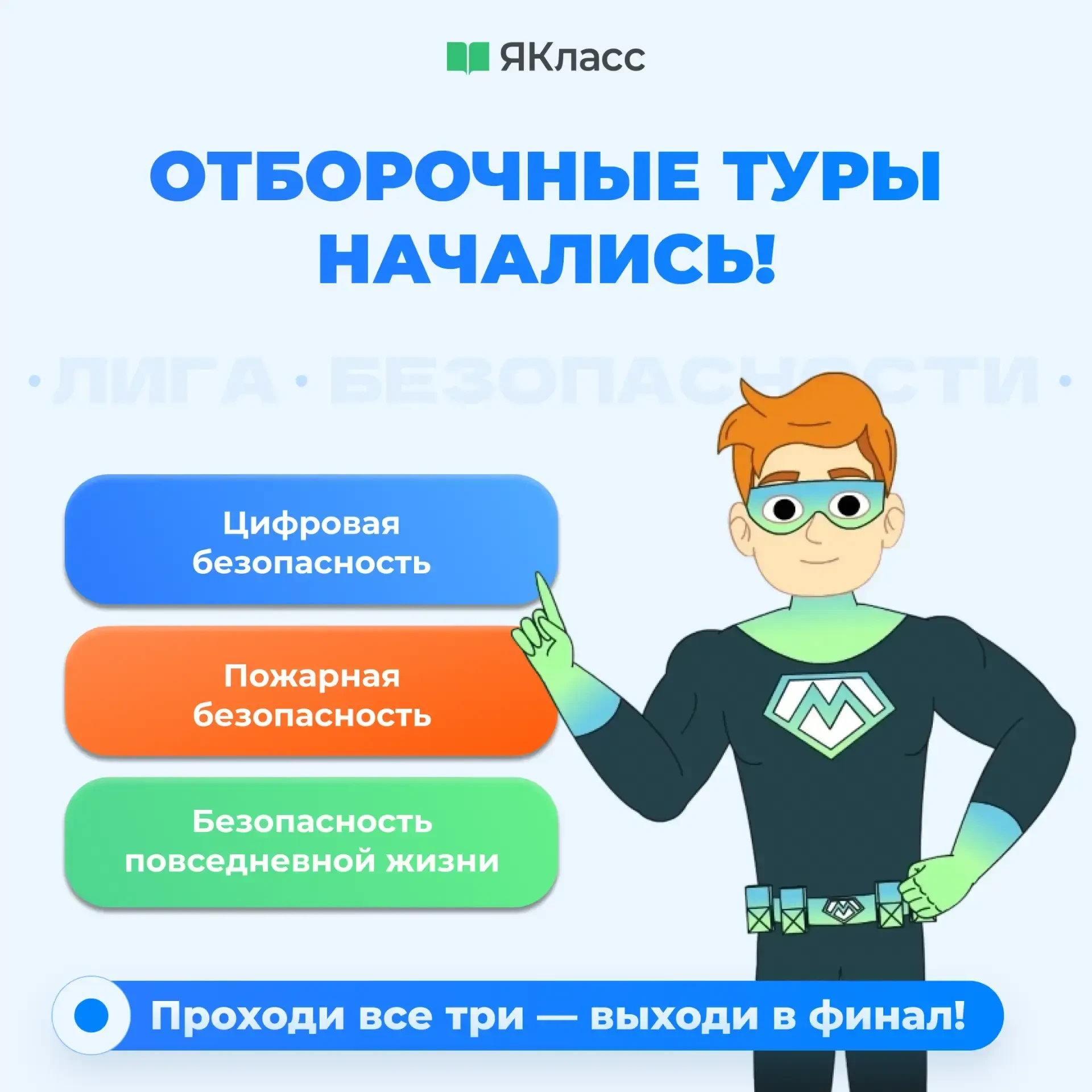 Всероссийская онлайн-олимпиада «Лига безопасности» стартовала на ЦОР «ЯКласс»! Приглашаем школьников 1–11 классов проверить свои знания в цифровой, пожарной и повседневной безопасности. Основными задачами Олимпиады являются: — формирование у школьников и студентов среднего профессионального образования ответственного отношения к вопросам безопасности в повседневной жизни и цифровой среде; — развитие компетенций, способствующих предотвращению рисков чрезвычайных ситуаций; — профилактика правонарушений и формирование культуры безопасного поведения; — поддержка реализации Плана мероприятий по исполнению Стратегии комплексной безопасности детей в Российской Федерации на период до 2030 года (распоряжение Правительства Российской Федерации от 17 ноября 2023 года № 3233-р). Сроки олимпиады: Регистрация: 10.11.2025 — 26.01.2026 Отборочные туры: 24.11.2025 — 26.01.2026 Финальный тур: 02.02.2026 — 15.02.2026 Как принять участие: Зарегистрируйте учеников по ссылкеhttps://go.yaklass.ru/competitions/30?registration=1 После регистрации задания появятся у учеников в разделе «Проверочные работы» Для прохождения в финал ученикам необходимо выполнить все 3 задания отборочных тура! Вас ждут : Дипломы и грамоты для учеников Благодарственные письма для учителей Вы можете скачать и разместить в школе плакаты: Цифровая безопасность - https://vk.cc/cRii1T