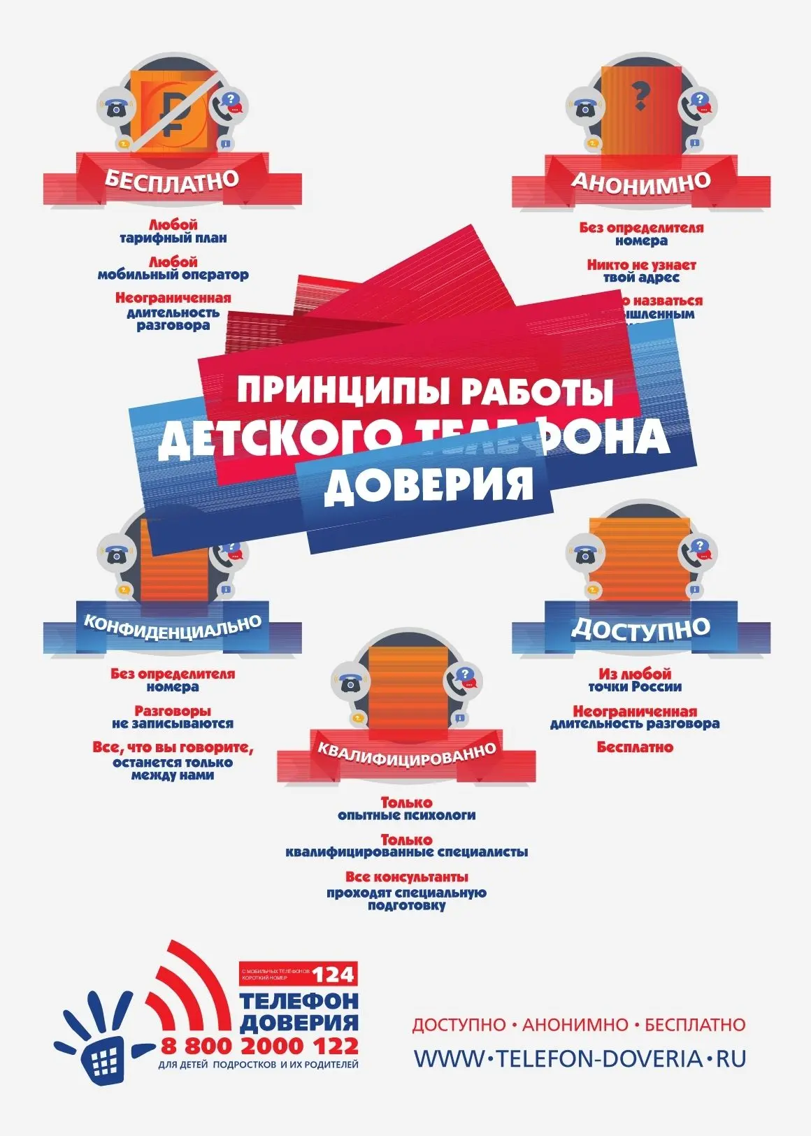 Детский телефон доверия – это наиболее доступный и значимый ресурс помощи детям и взрослым в решении социально-психологических проблем. Круглосуточно, анонимно и бесплатно – основные принципы работы детского телефона доверия. Частыми темами для обращения являются: детско-родительские отношения, отношения со сверстниками, подростки обращаются по теме взаимоотношений с противоположным полом. Также и детей, и родителей беспокоят вопросы учебы и дальнейшего профессионального самоопределения.