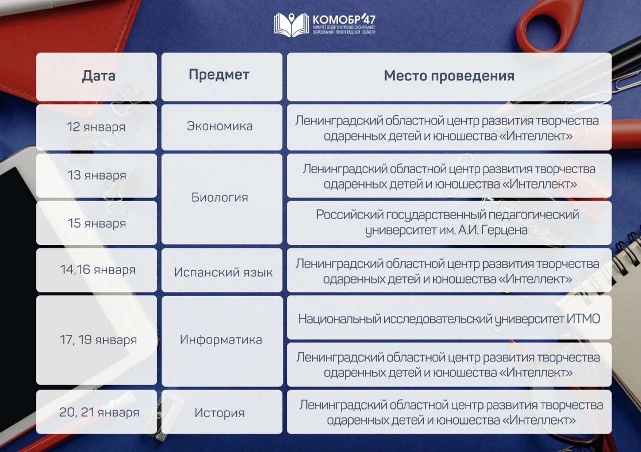 На протяжении двух месяцев старшеклассники продемонстрируют свои знания по 23 предметам: от астрономии до китайского языка. Ребята, набравшие необходимое количество баллов, войдут в состав региональной сборной и представят Ленинградскую область на заключительном этапе Олимпиады.