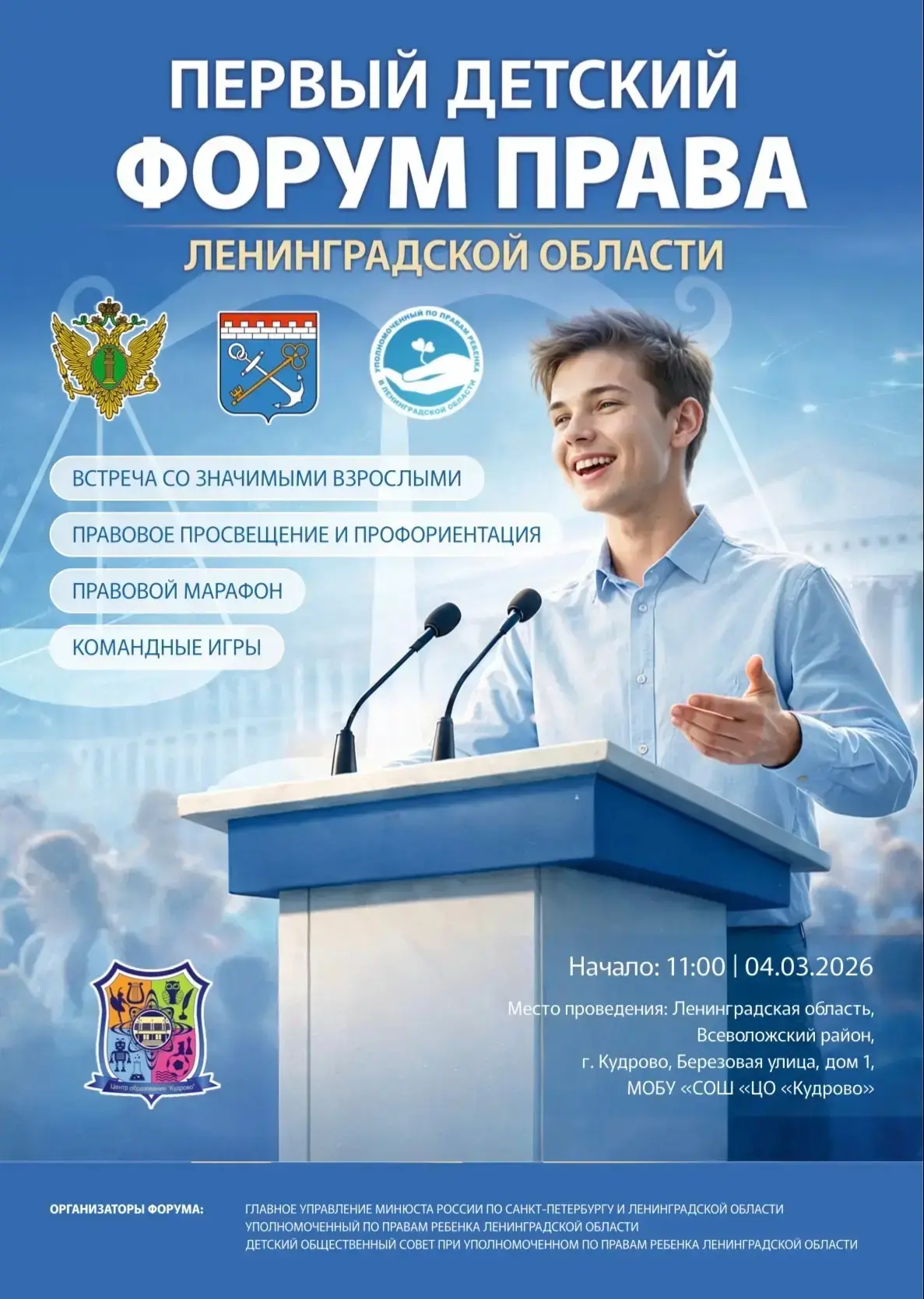 По инициативе Уполномоченного по правам ребенка в Ленинградской области совместно с Главным управлением Министерства юстиции Российской Федерации по Санкт-Петербургу и Ленинградской области и Детским общественным советом при Уполномоченном по правам ребенка в Ленинградской области сегодня, 4 марта 2026 года, начинается первый детский Форум Права Ленинградской области.
