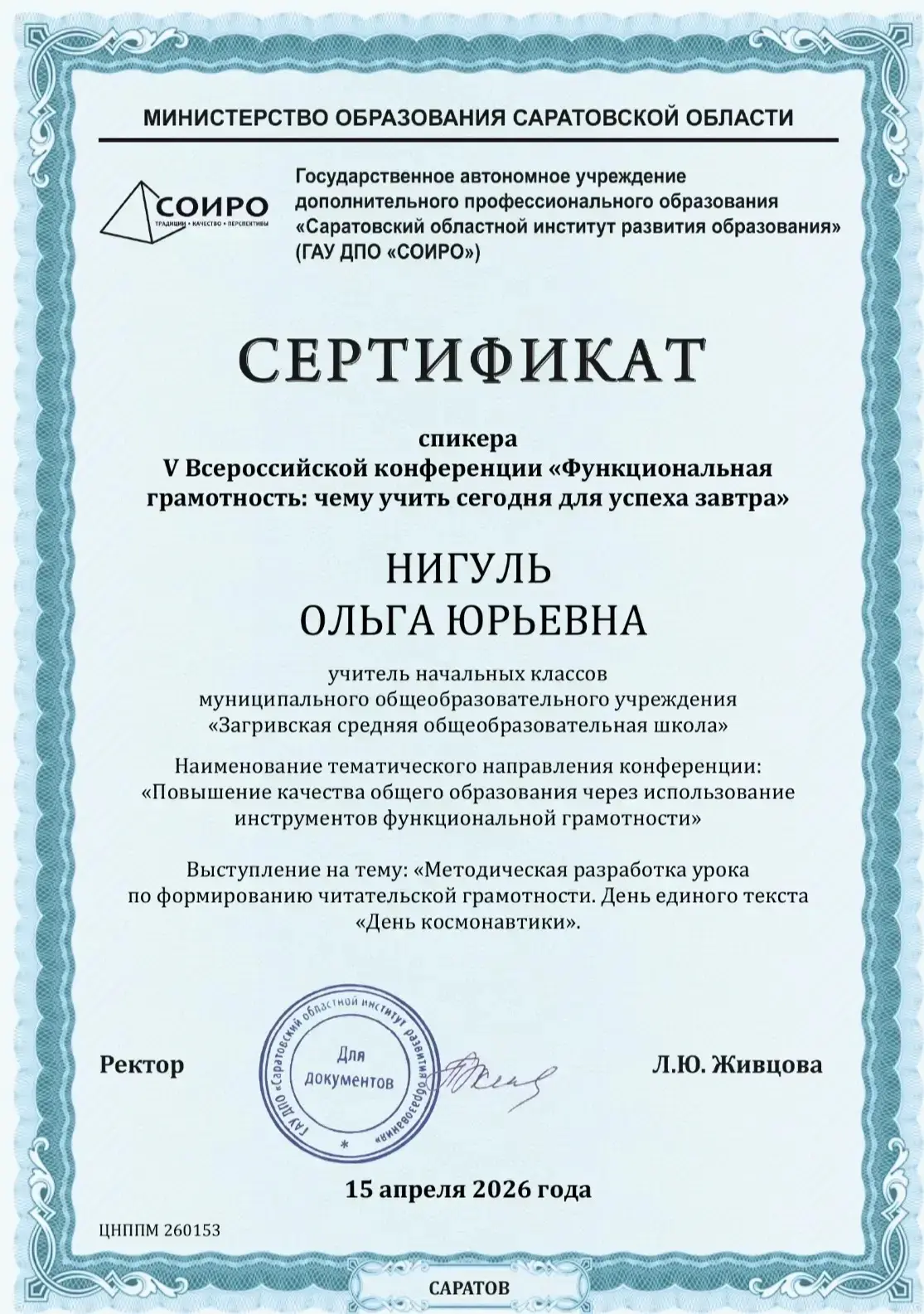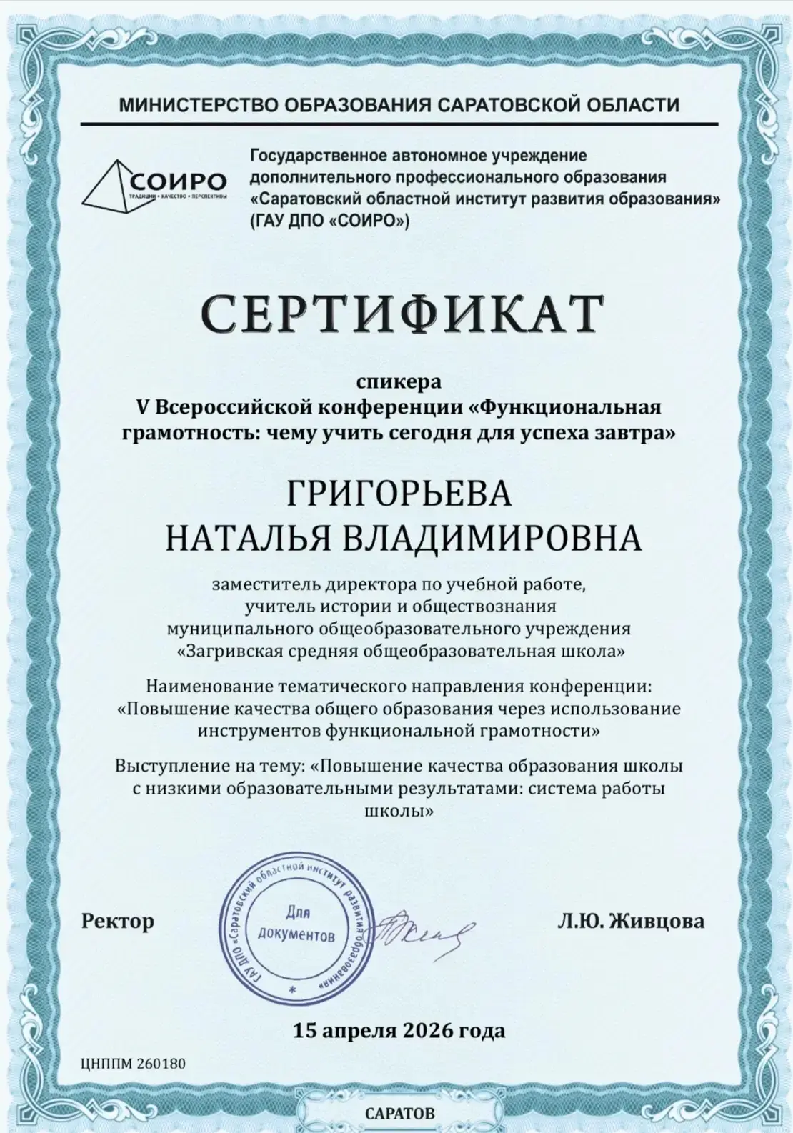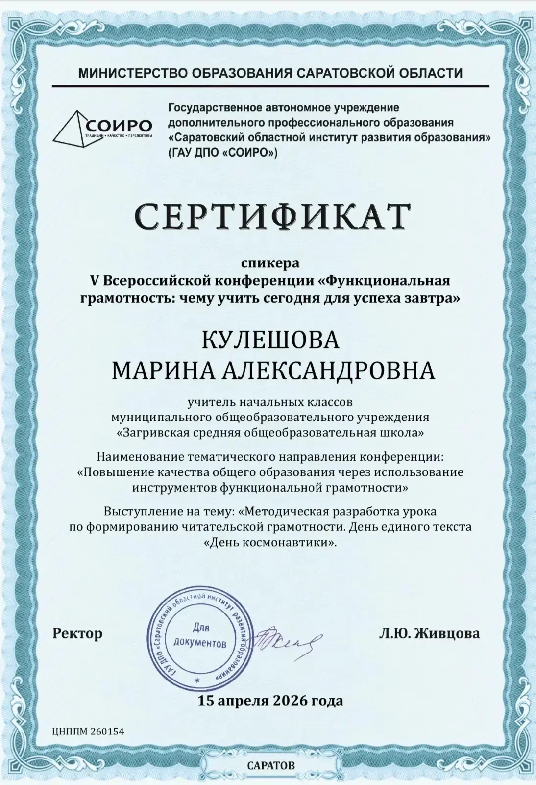 15 апреля состоялась V юбилейная всероссийская конференция «Функциональная грамотность: учить сегодня для успеха завтра», организованная Государственным автономным учреждением дополнительного профессионального образования «Саратовский областной институт развития образования» и Центром непрерывного повышения профессионального мастерства педагогических работников.