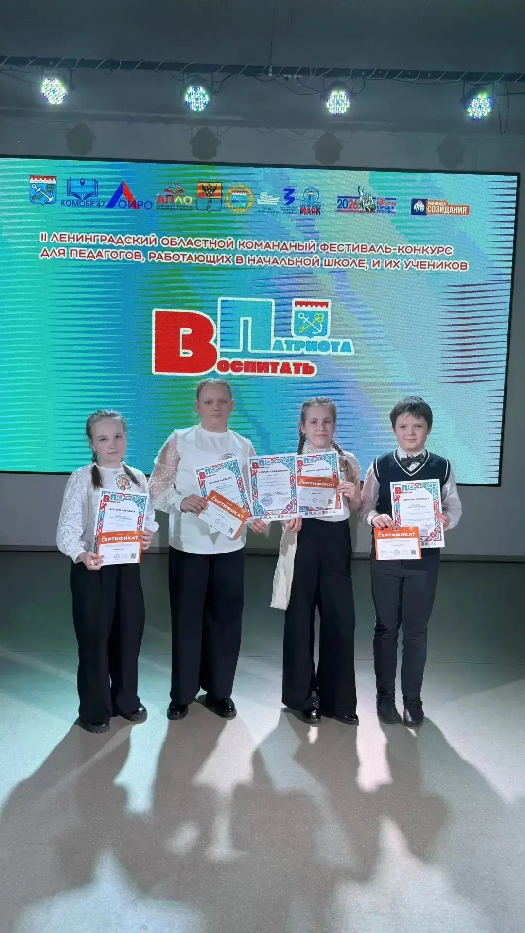 10 апреля обучающиеся 4 класса МОУ "Старопольская СОШ" — Клопова Екатерина, Васильева Полина, Зиновьева Виктория и Рыбалко Тимур — в сопровождении классного руководителя Юдиной Дарьи Денисовны отправились на финал фестиваля‑конкурса «Воспитать патриота» в Вырицу!