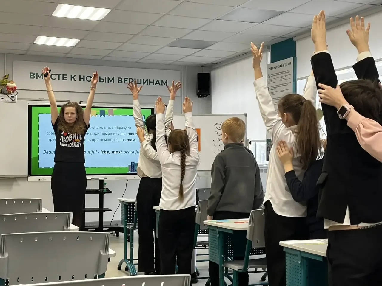 Бинарный урок в 4а классе на тему «Использование степеней сравнения имен прилагательных в русском и английском языках» провели М.И. Исевич, учитель начальных классов и Э.Н. Макарова, учитель английского языка. Они представили форму проведения урока, где материал дается детям параллельно по двум предметам, взаимно дополняя друг друга.