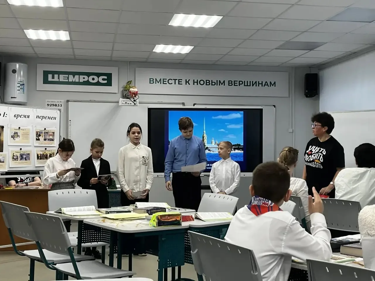 Первый урок был представлен в виде интегрированного занятия в 4д классе. Учитель начальных классов Е.И. Иванова и учитель изобразительного искусства Н.А. Ларионова представили увлекательный урок-путешествие: обучающиеся выполняли практические задания, работали со словом в словаре, находили отличия, сходства в правлении царей, отвечали на сложные вопросы, заканчивали рисунок Петропавловской крепости в разных техниках.