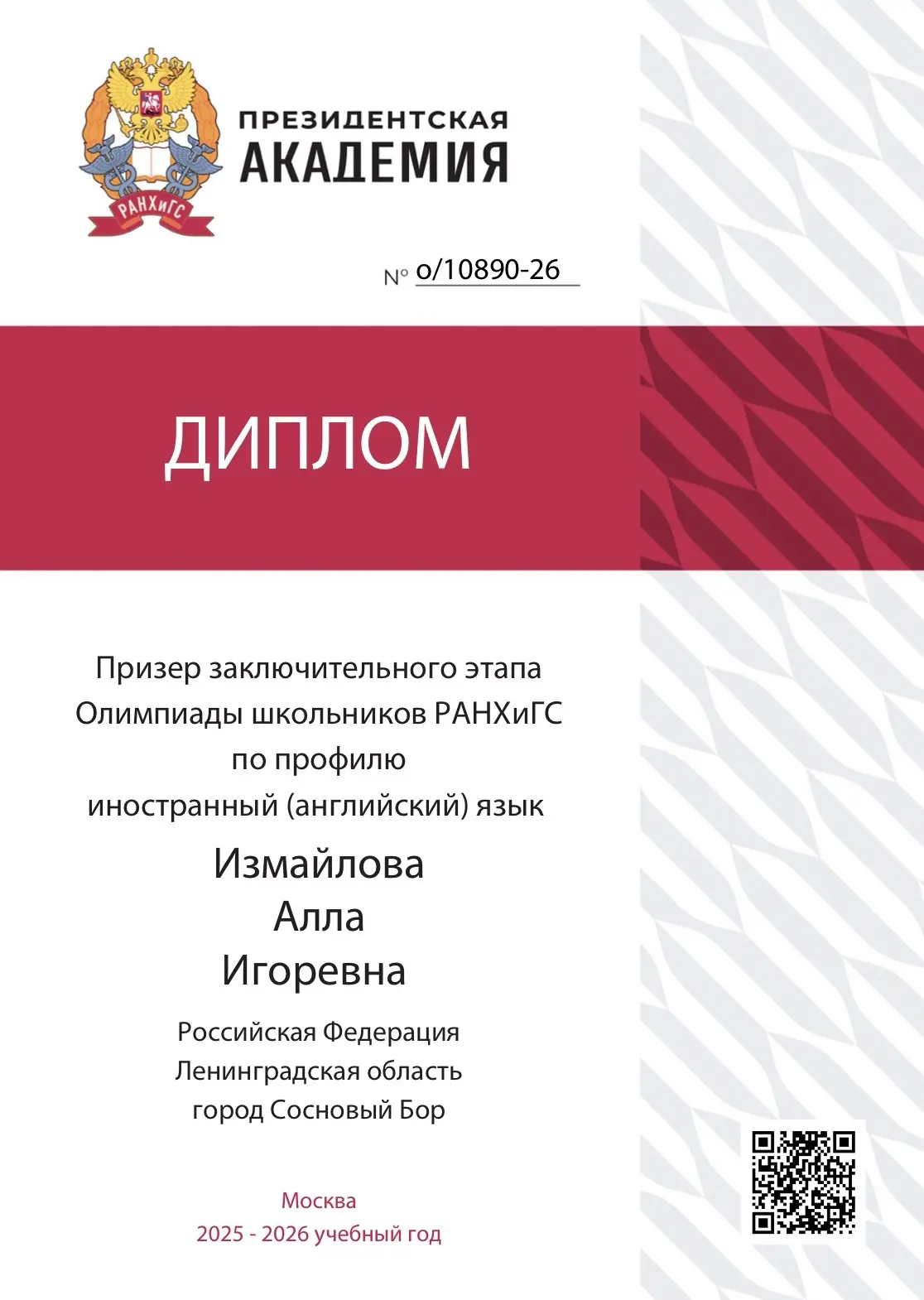 👏👏👏Поздравляем Измайлову Аллу, ученицу 9б класса, с победой в заключительном этапе олимпиады школьников РАНХиГС по профилю иностранный (английский) язык!!!