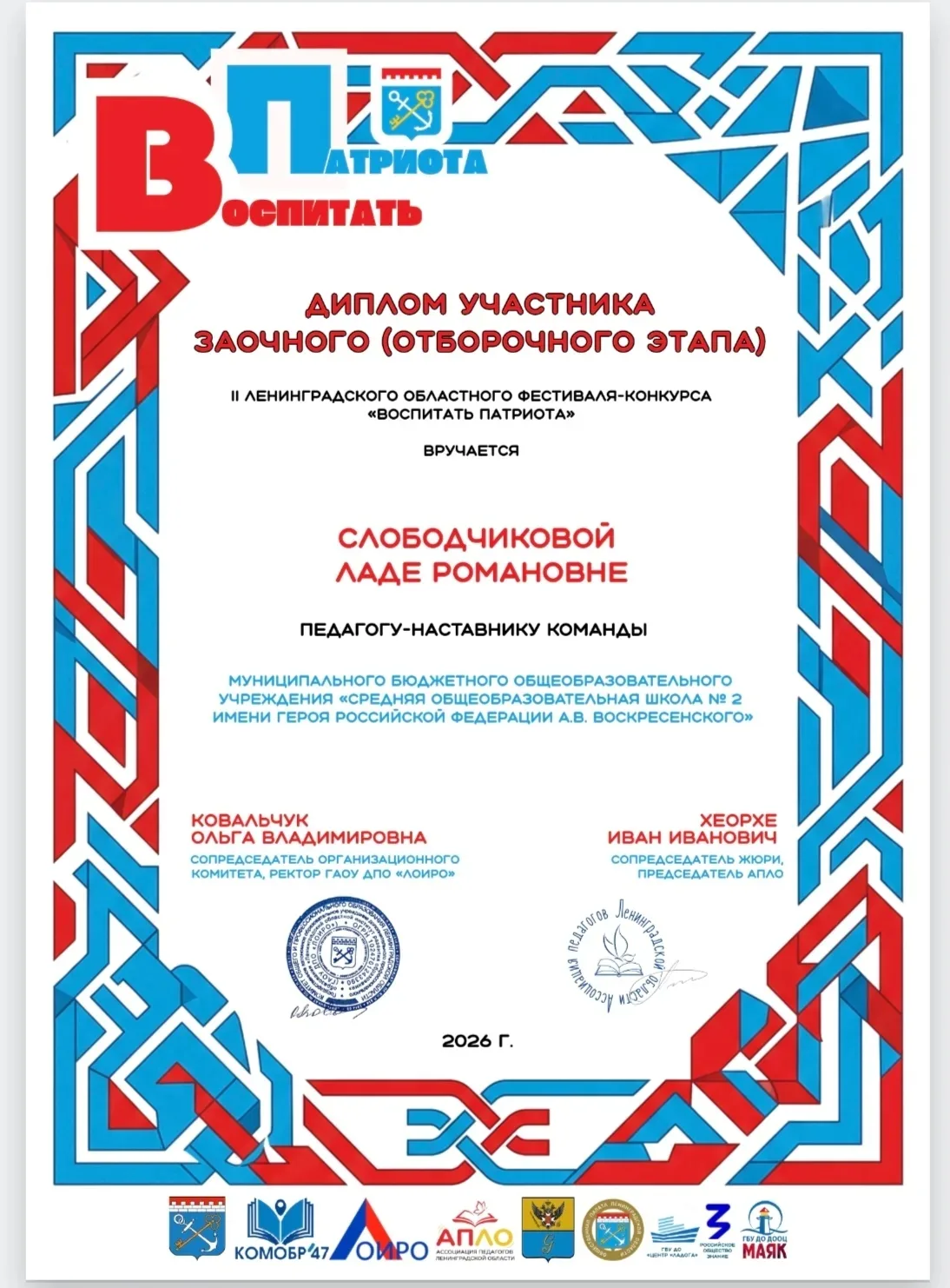 ⚡Ученики 3«А» класса совместно с классным руководителем Слободчиковой Ладой Романовной приняли участие в заочном этапе II Ленинградского областного командного фестиваля-конкурса «Воспитать патриота 2026». Команда прошла в финал соревнования, который состоится на базе ДООЦ «Маяк» в апреле.