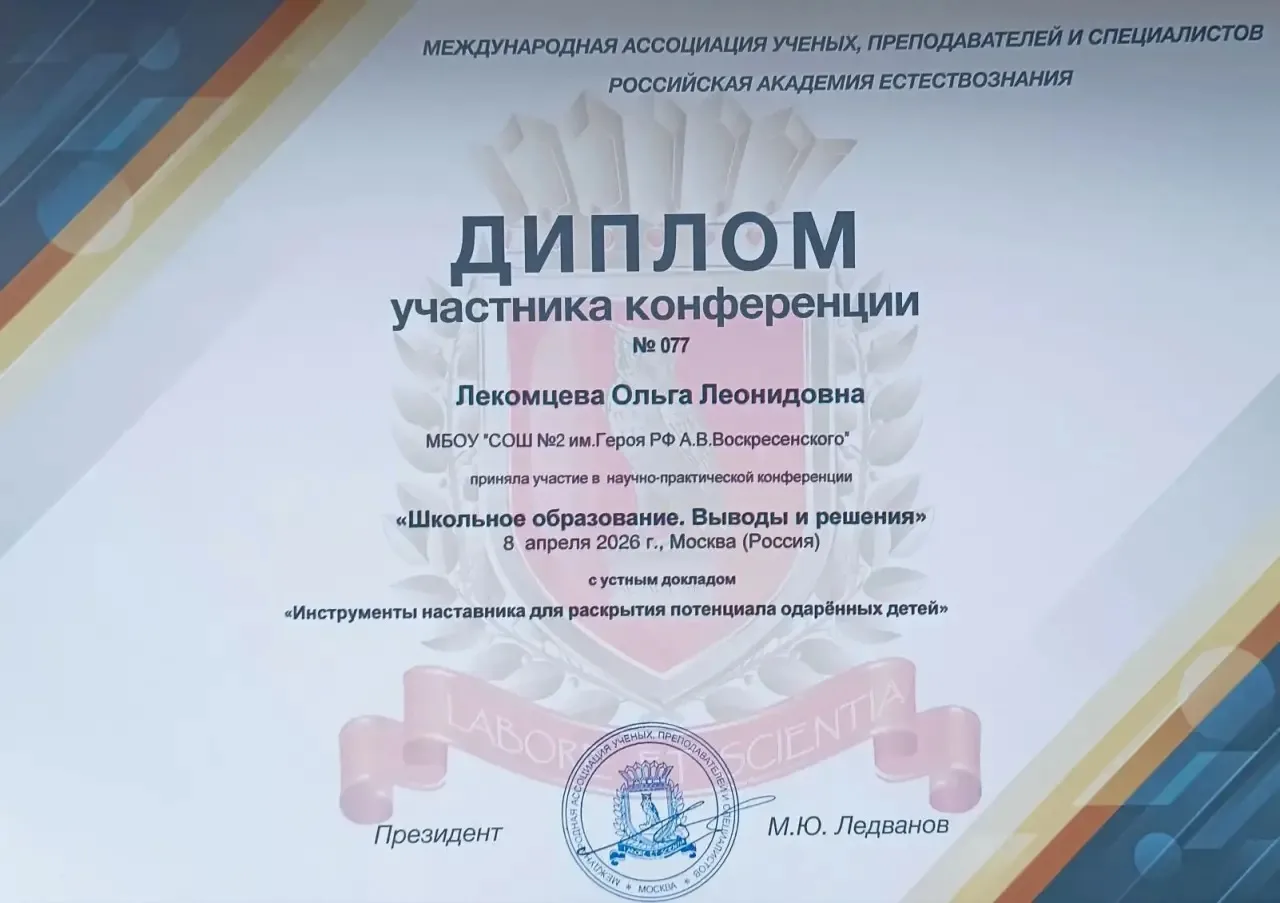 ✅ В рамках форума учитель химии Лекомцева Ольга Леонидовна приняла участие в конференции «Дополнительное и внеурочное образование школьников по химии и биологии в условиях ФГОС-2026»