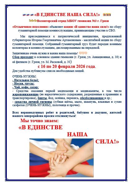 «Отзывчивое поколение» объявляет акцию «В единстве наша сила!» по сбору гуманитарной помощи военнослужащим, принимающим участие в СВО.