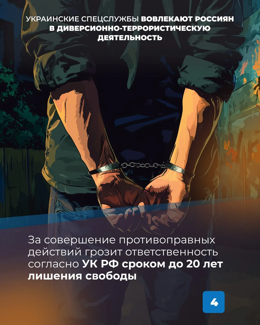 Сейчас украинские спецслужбы активно вовлекают россиян в противоправную деятельность. Будьте внимательны! Не доверяйте незнакомым людям, не поддавайтесь на угрозы и психологическое давление.