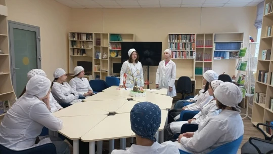 В честь праздника студенты 1‑го курса специальности «Лабораторная диагностика» ГАПОУ «ЕМК им. К. С. Константиновой» вместе с куратором группы Е. С. Меренковой отправились на познавательную экскурсию в мастерскую «Лабораторный медицинский анализ» на территории нашего колледжа.