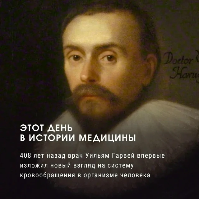 🫀 16 апреля 1618 года английский врач Уильям Гарвей на публичной лекции в Лондоне представил революционный взгляд на физиологию человека. Основываясь на результатах многочисленных опытов, он впервые доказал, что кровь в организме теплокровных животных не просто «приливает» к органам, а постоянно движется по замкнутому циклу. Свои выводы он позже закрепил в фундаментальном труде «Анатомическое исследование о движении сердца и крови у животных».
