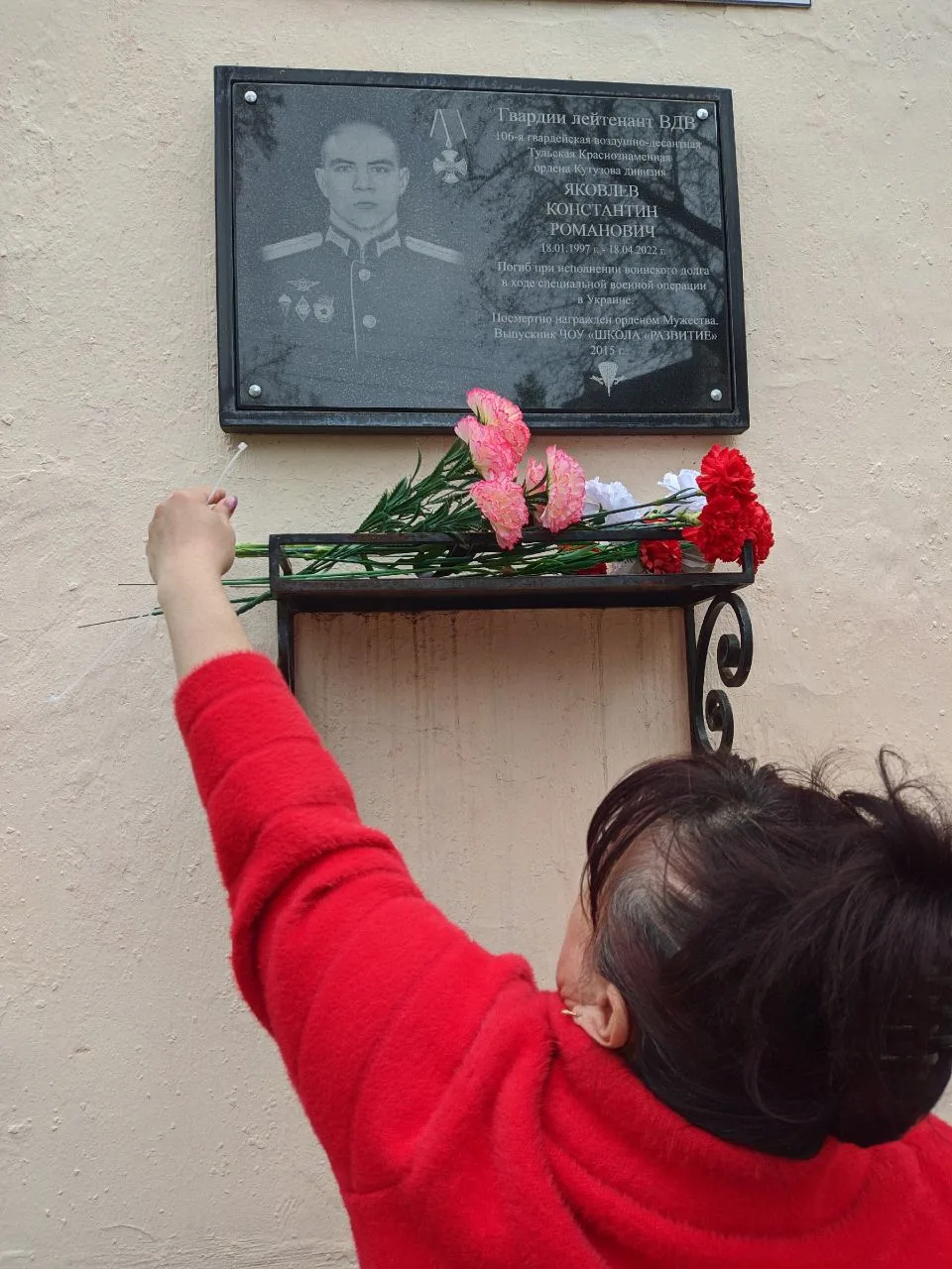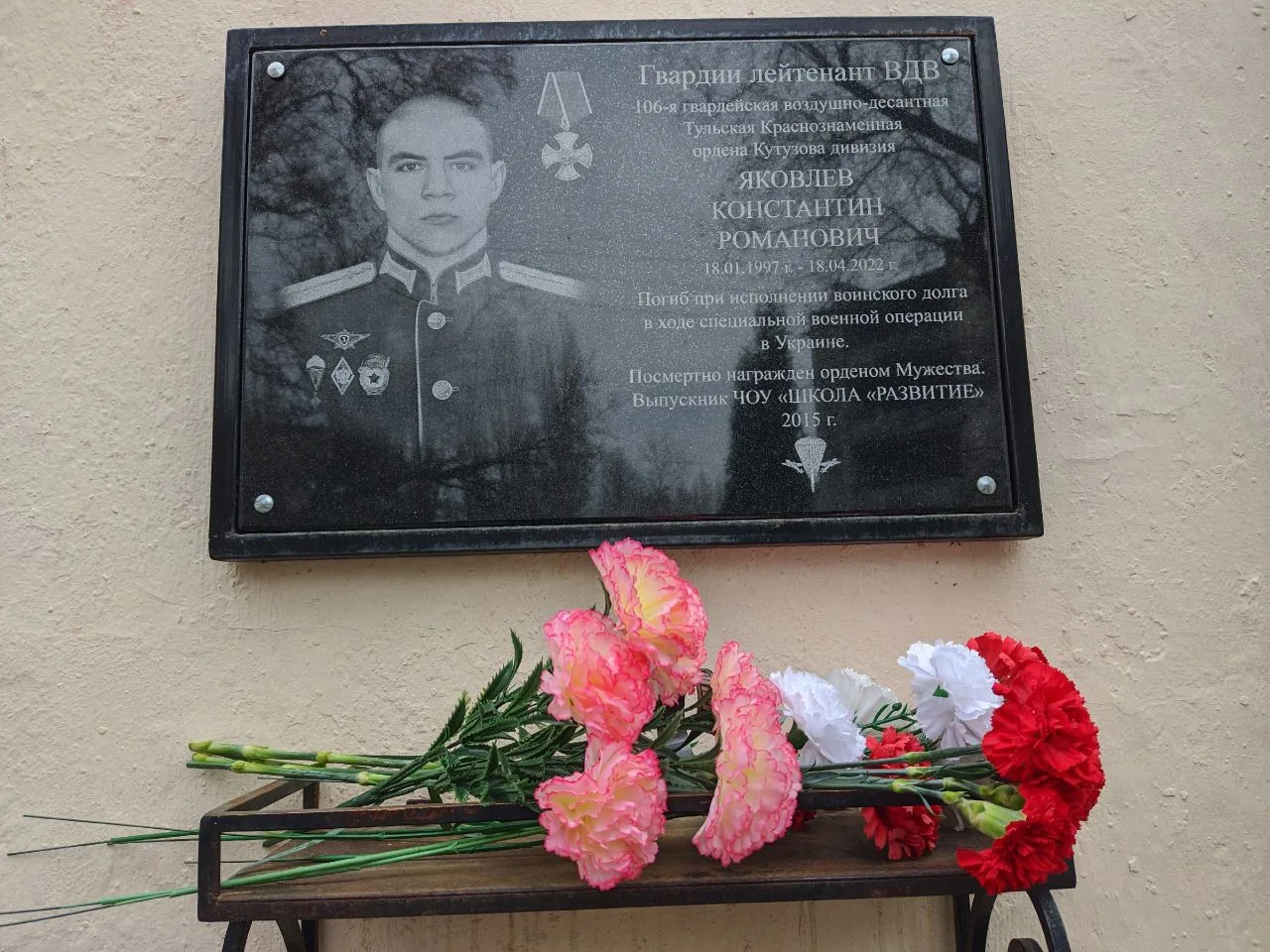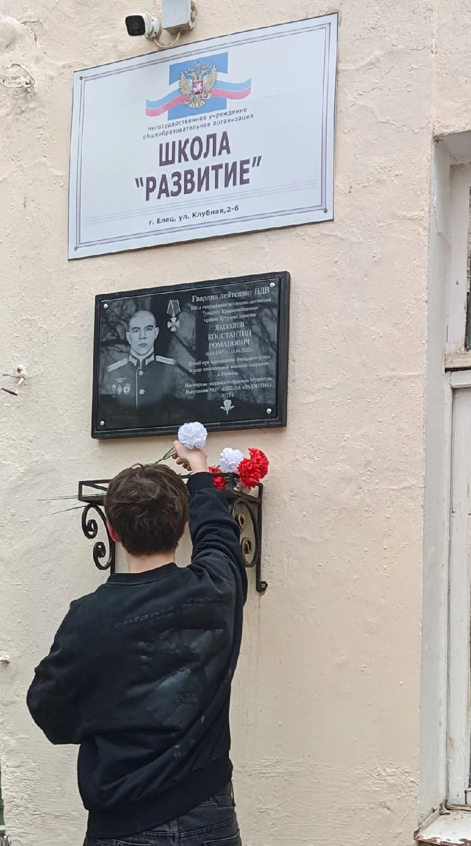 17 апреля 2026 года учебный день в ЧОУ «ШКОЛА «РАЗВИТИЕ» начался с митинга, приуроченного к годовщине гибели в ходе СВО выпускника 2015 года Яковлева Константина Романовича. Сотрудники и обучающиеся собрались у памятной доски, чтобы вспомнить русского офицера Константина.