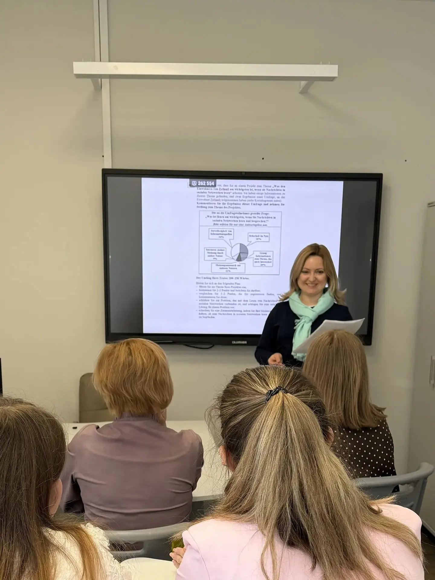 Особый интерес коллег вызвал мастер-класс учителя немецкого языка МБОУ «СШ №8 г. Ельца» Целых Е. А. Она детально разобрала с коллегами задание по составлению развернутого письменного высказывания на основе таблицы или диаграммы — один из самых сложных элементов экзамена.