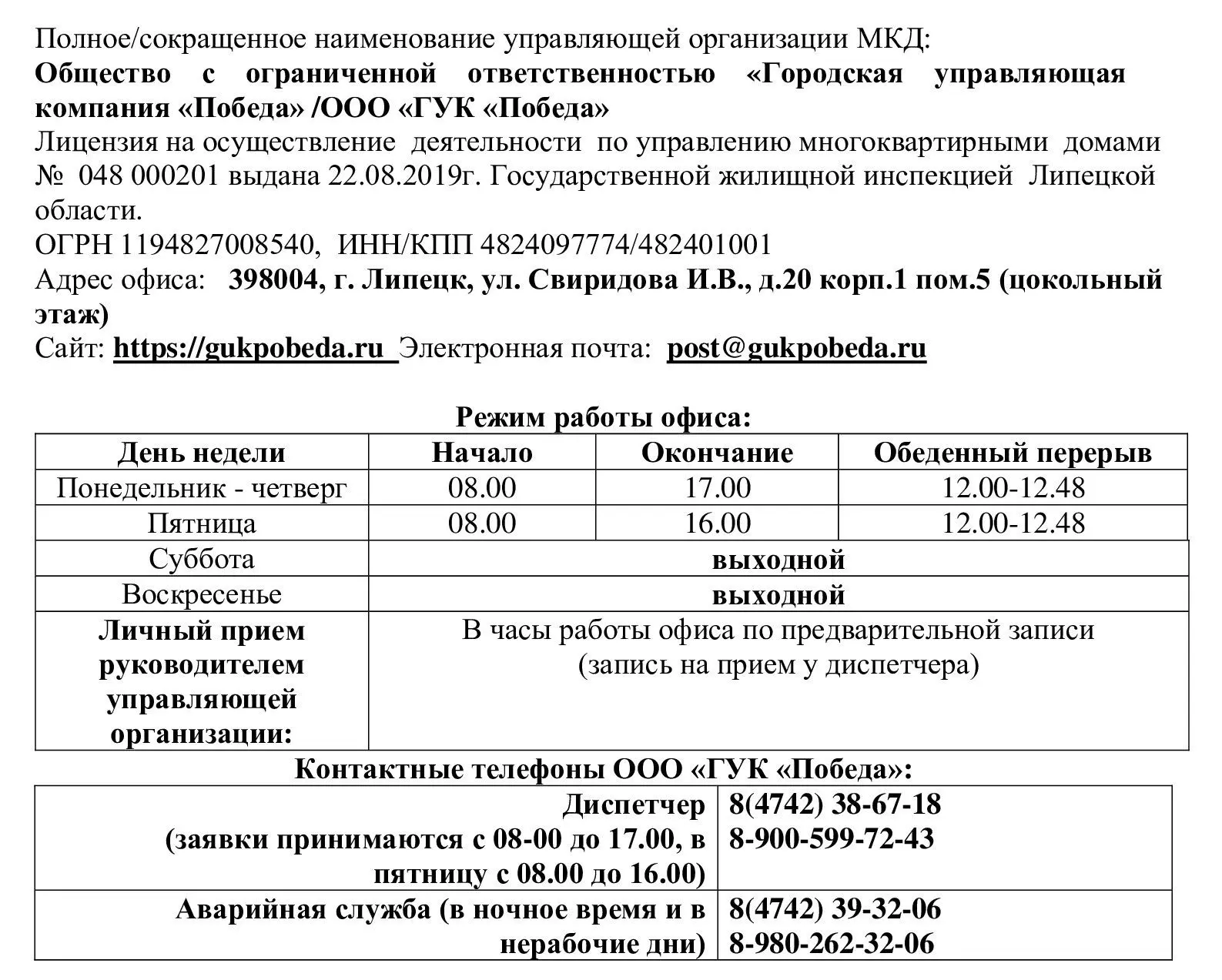 Сведения об ООО "ГУК "Победа"