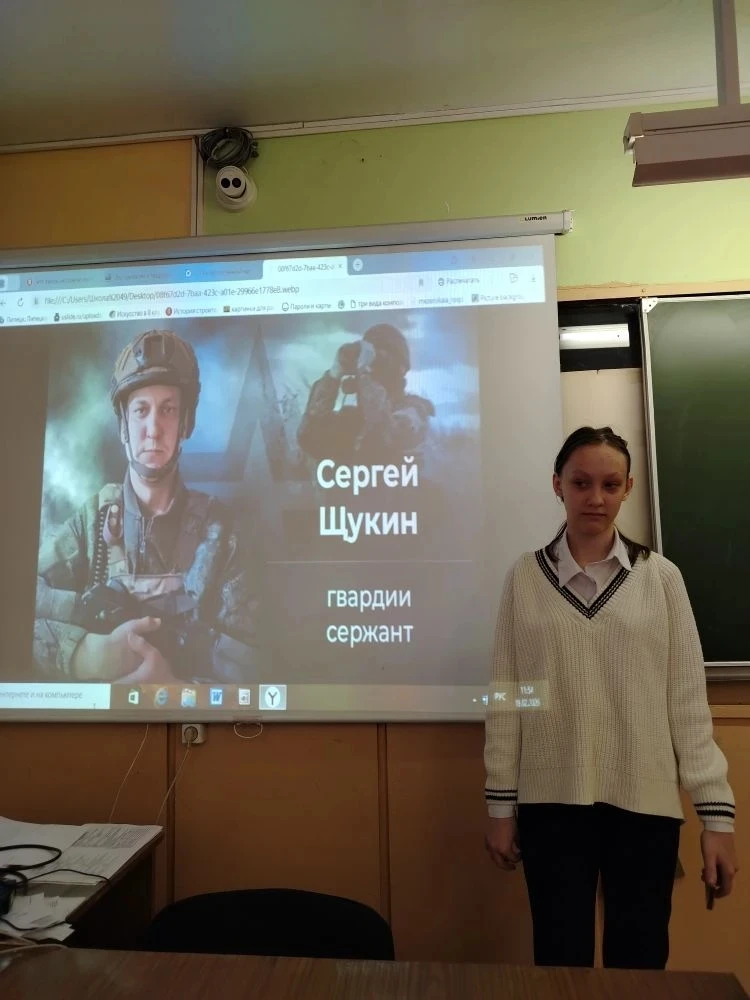 Учащиеся познакомились с информацией о героическом поступке Щукина Сергея - папы ученицы 5Г класса Щукиной Виктории и ученика 1В класса Щукина Константина.