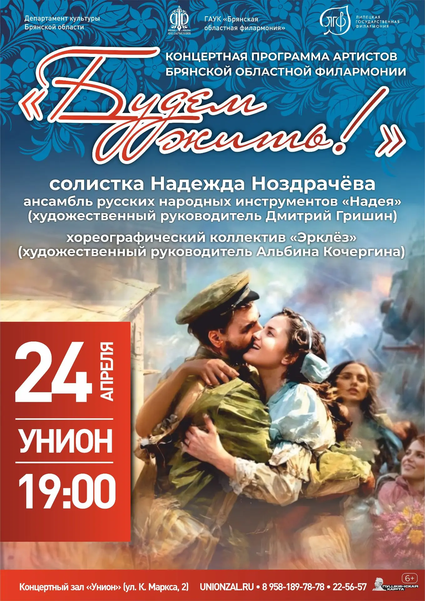 Друзья, 24 апреля на нашей сцене в рамках культурного сотрудничества с Брянской областной филармонией будет показана концертная программа «Будем жить!»