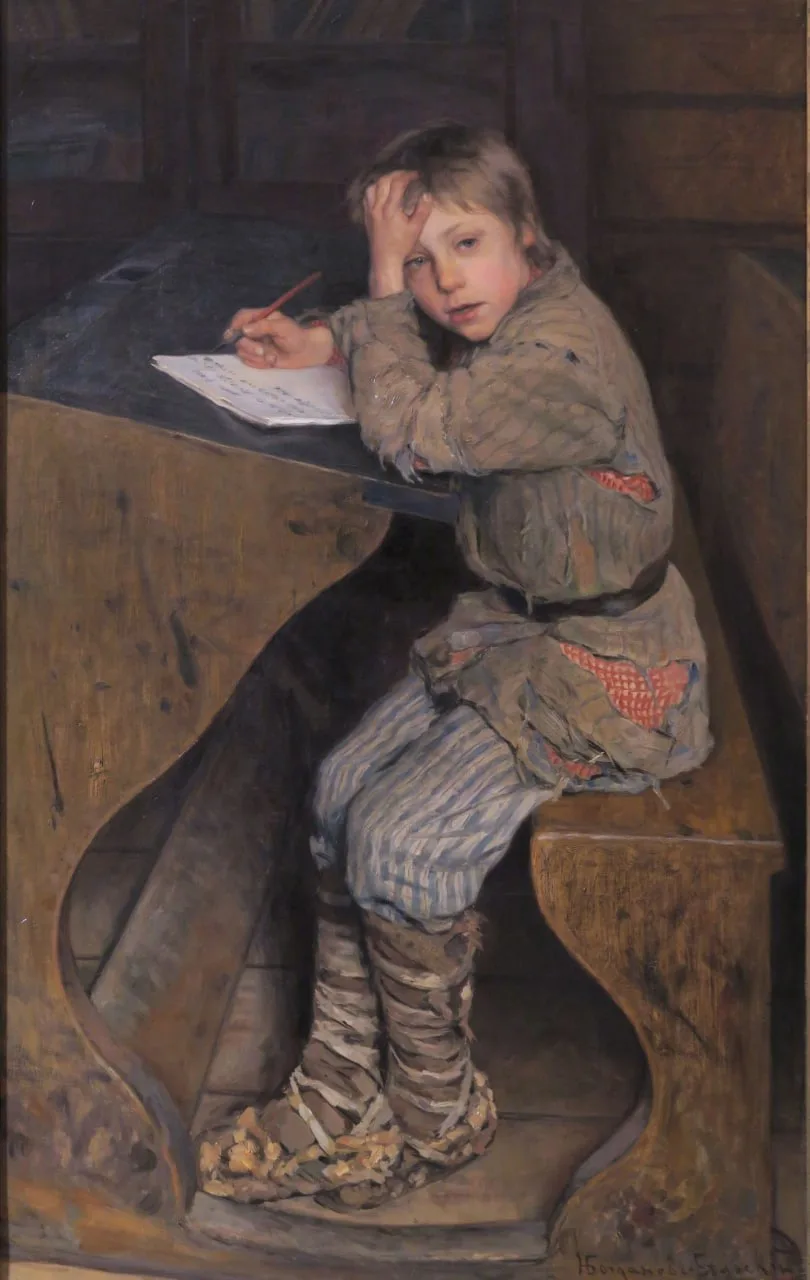 В центре композиции — фигура сидящего за партой подростка, как бы высвеченная лучом из полутьмы. Тщательно выполненному в гамме охристых тонов полотну свойственна жизненная непосредственность. Полна естественной грации поза героя в бедной одежке, трогательно его миловидное бледное лицо в момент «мыслительного» процесса.