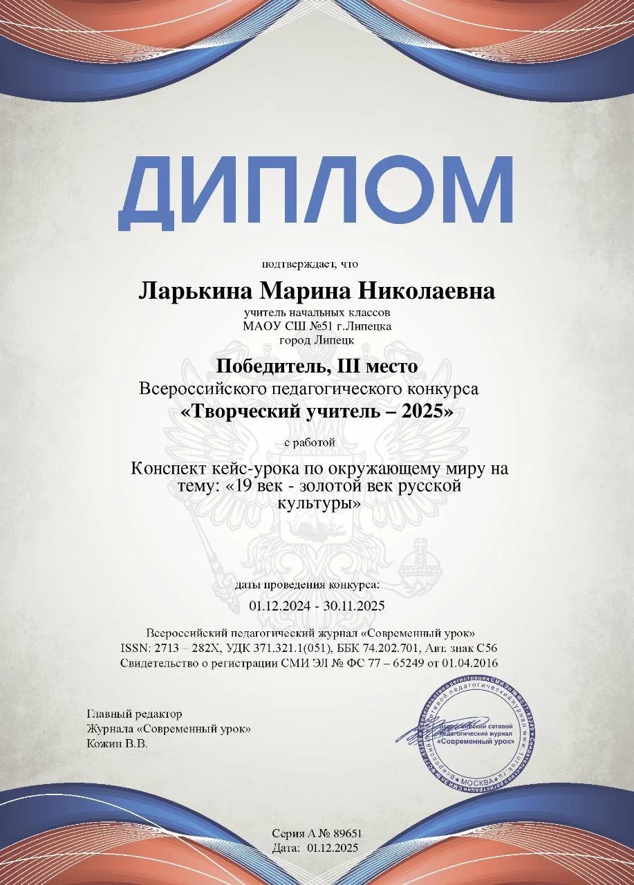 Учитель начальных классов Ларькина Марина Николаевна стала победителем (III место) Всероссийского педагогического конкурса «Творческий учитель – 2025».