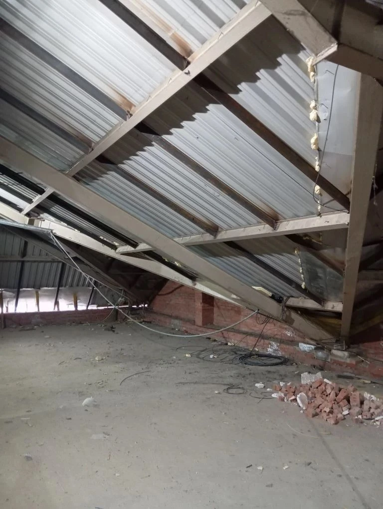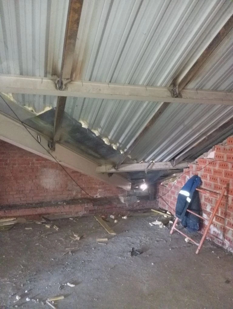 В учебном корпусе Гимназии ведутся строительно-монтажные работы по ремонту крыши: осуществляется демонтаж стяжки пола чердака и усиление опорных частей кровли.