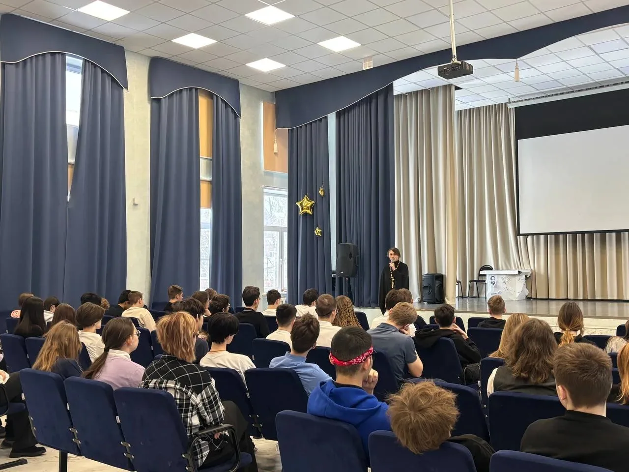 20 февраля в рамках проекта "Диалог со священником" состоялась очередная встреча школьников с иереем Романом Маисурадзе. Для учеников 8б, 8в, 8г и 10б классов отец Роман провел беседу о счастье в христианском понимании. Ученики не только сами постарались ответить на этот вопрос, но и задумались, как эта тема отражалась в русской классической литературе, в частности, в поэме М. Ю. Лермонтова "Мцыри".